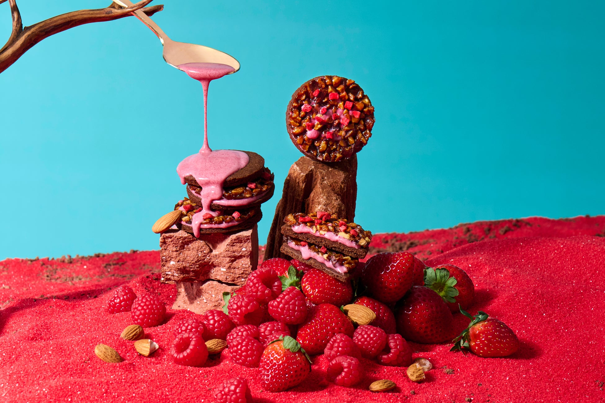 「Nutsの美味しさが開花する」ナッツが主役のお菓子を展開。大粒のアーモンドダイスにチョコレートソースを絡め、フリーズドライいちごをトッピングした、新商品「フロランショコラサンド〈ダブルベリー〉」は、福岡地区初の販売です。