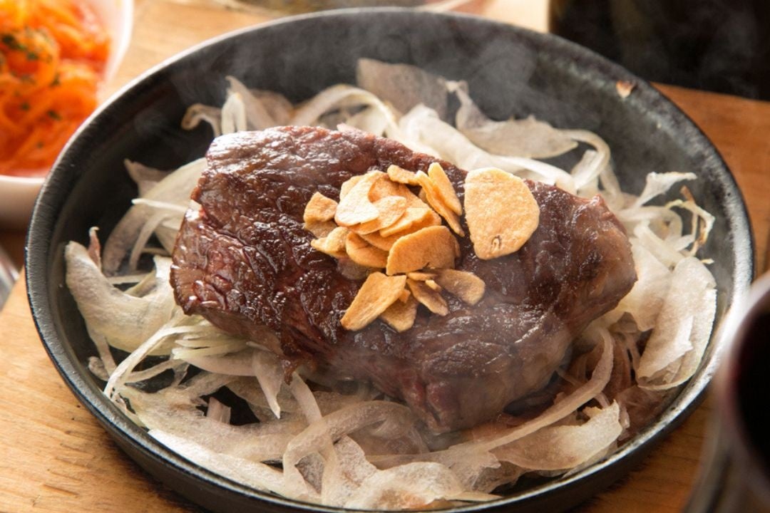 良質なお肉を厚くカットし、香ばしく焼き上げたビフテキは、肉の旨味とジューシーさが絶妙にマッチ!オリジナルのステーキソースとトマトソースの2種類のタレをご用意しており、お好みに合わせてお楽しみいただけます。