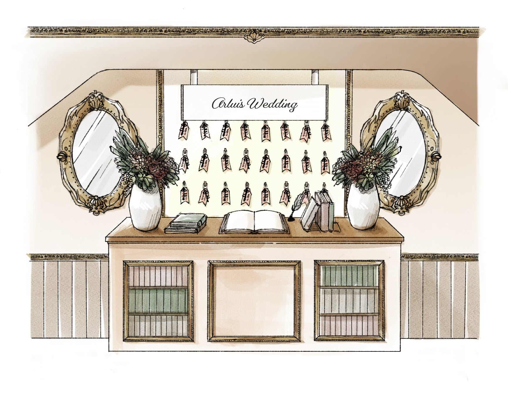 エントランスからウエディングブースへと抜けるアプローチには、コミュニケーションコーナー『アールイズ・フロント』を設置。空間としても機能としても、ホテルのフロントのように訪れるお客様に対して歓迎の意思を示す場となっています。お客様が結婚式を決めた瞬間(チェックイン)から結婚式へ出発(チェックアウト)までの間、同じ想いや不安を胸にグランフロント大阪本店で結婚式の準備をするお客様同士がひとつにつながるシンボリックな場所となります。