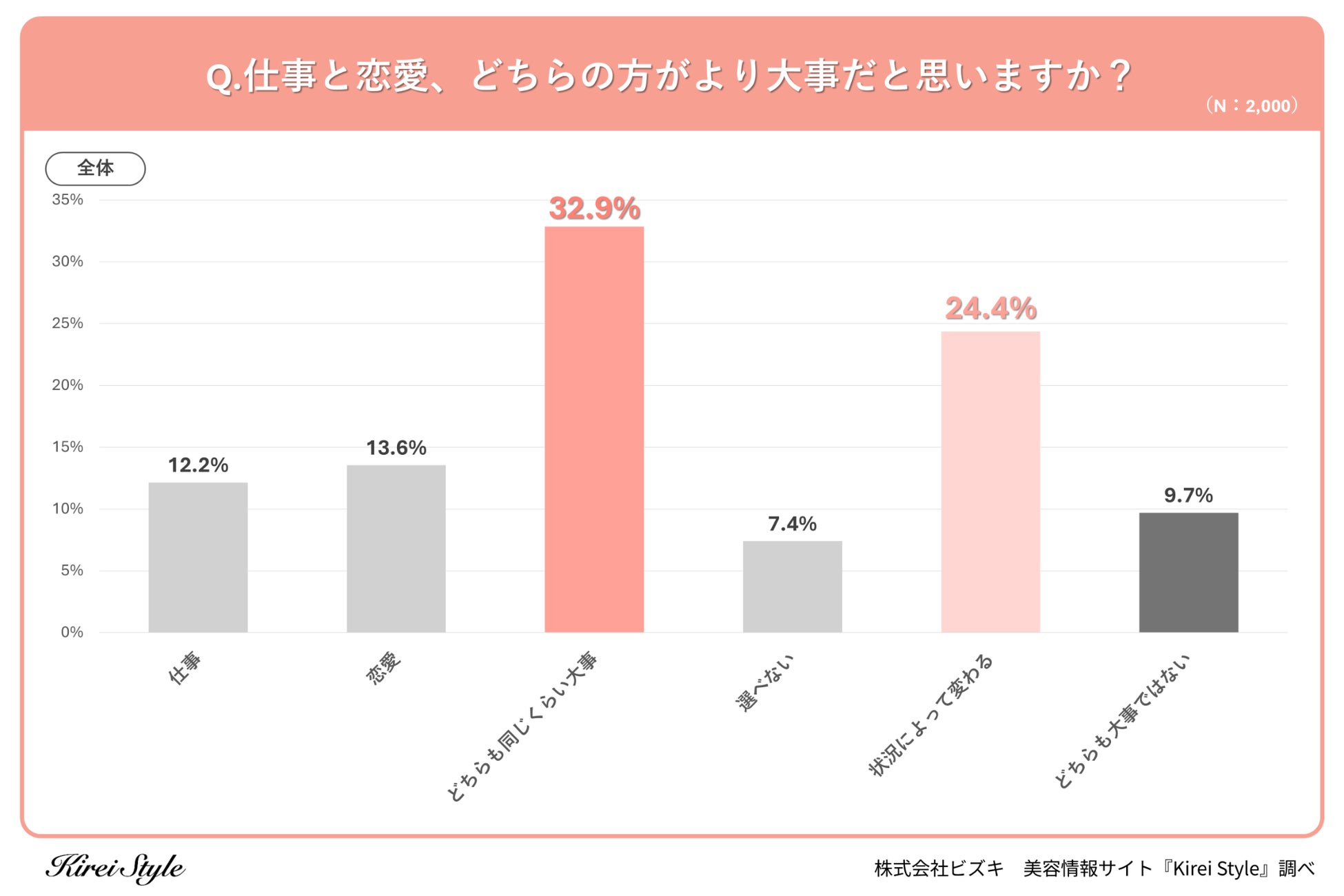 全国の20代~50代の女性2,000人を対象に、「仕事と恋愛、どちらの方がより大事だと思いますか?」というアンケートを実施したところ、最も多かった回答は「どちらも同じくらい大事」で32.9%となりました。次いで、「状況によって変わる」が24.4%、「恋愛」が13.6%と続く結果となりました。