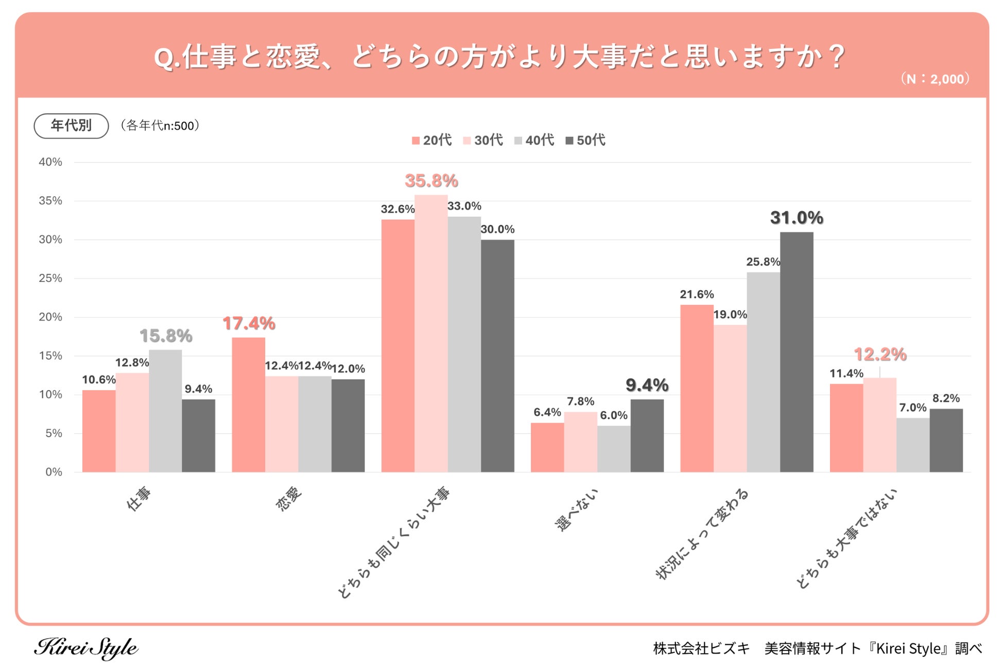 年代別に見ると、どの年代でも「どちらも同じくらい大事」の割合が高く、仕事と恋愛のバランスをうまく取りながら充実した生活を送りたいと考える方が多いようです。