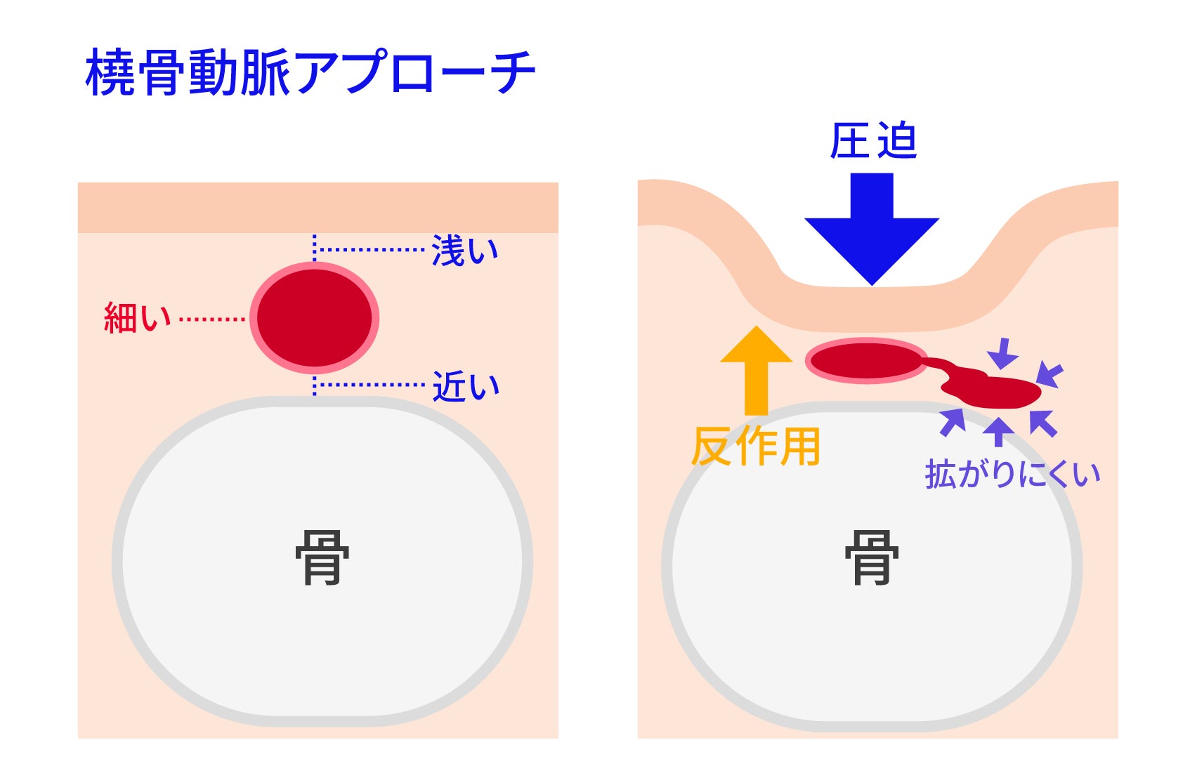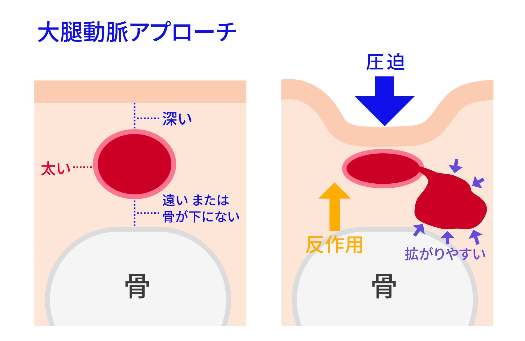TFAで穿刺する大腿動脈は、体表から比較的容易に穿刺できる太い動脈であるため、カテーテル治療に用いる太いカテーテルを無理なく挿入できる利点がある一方で、大腿動脈は血流量が多いため、止血に時間を要し、術後数時間はベッドで安静が必要となります。また穿刺部の出血性合併症を起こすリスクがあります。体表ではなく皮下内で出血が広がった場合には、出血量が多くても体表からの観察では出血の存在がわかりにくく、重篤な状態となることもあるなど、TFAによる術後管理には課題が存在しています 。