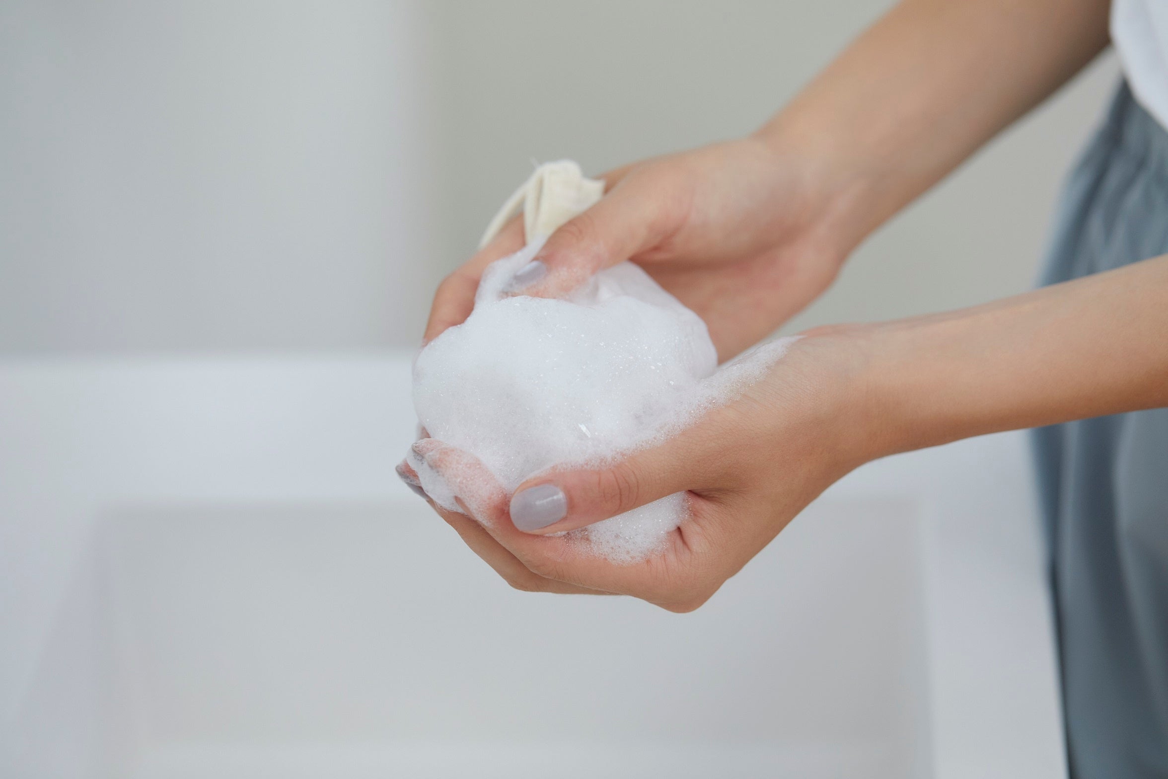 泡立てネットに水かぬるま湯を含ませ、水気を切ったら、500円玉程度の量を目安にネットの上にのせ、空気を取り込むようにもみ込んで泡立てる。または、手のひらで泡立ててもOK。