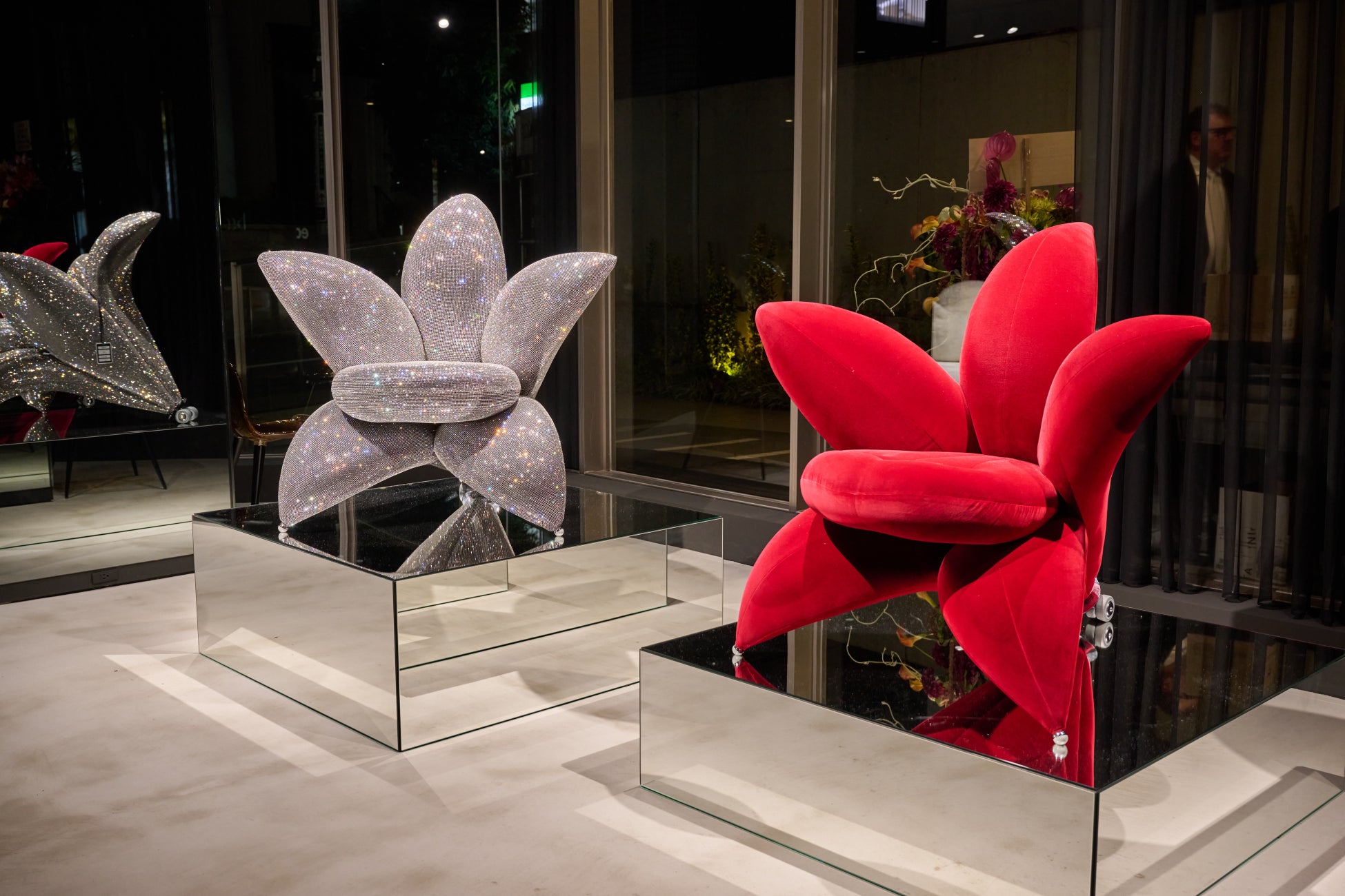第3部では、一般のお客様にも来場いただき、ハープの音色とスワロフスキーの輝きに包まれた幻想的なナイトイベントを開催。会場中央には、全体をスワロフスキークリスタルで覆った希少な超高級チェア「Getsuen Diamond」(デザイン:梅田正徳)が展示されました。