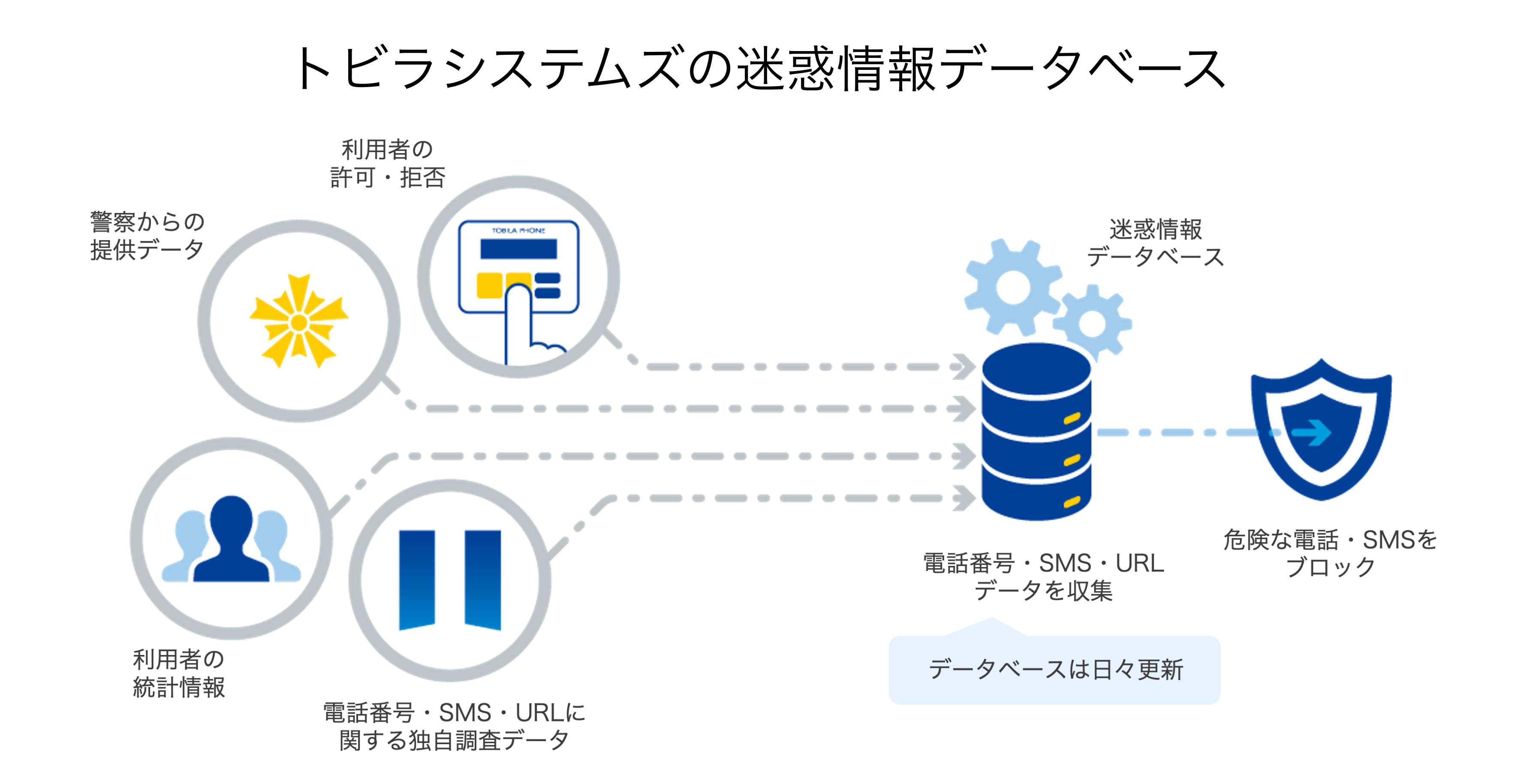 本オプションの「迷惑メッセージ・電話ブロック」で活用されるトビラシステムズの迷惑情報データベースは、警察、外部機関、利用者からの情報に加え、独自調査で収集した情報を統合データベース化することで、迷惑電話や迷惑SMSの検知に利用しています。