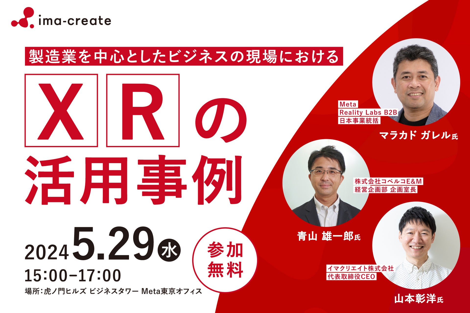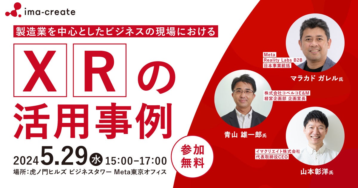 現実に作用する身体性のあるバーチャル技術の研究・開発を行うイマクリエイト株式会社(本社:東京都品川区、代表取締役CEO:山本彰洋、以下イマクリエイト)は、Meta日本法人と共催で製造業を中心としたビジネスの現場におけるXRの活用事例をご紹介するイベントを開催することをお知らせいたします。
