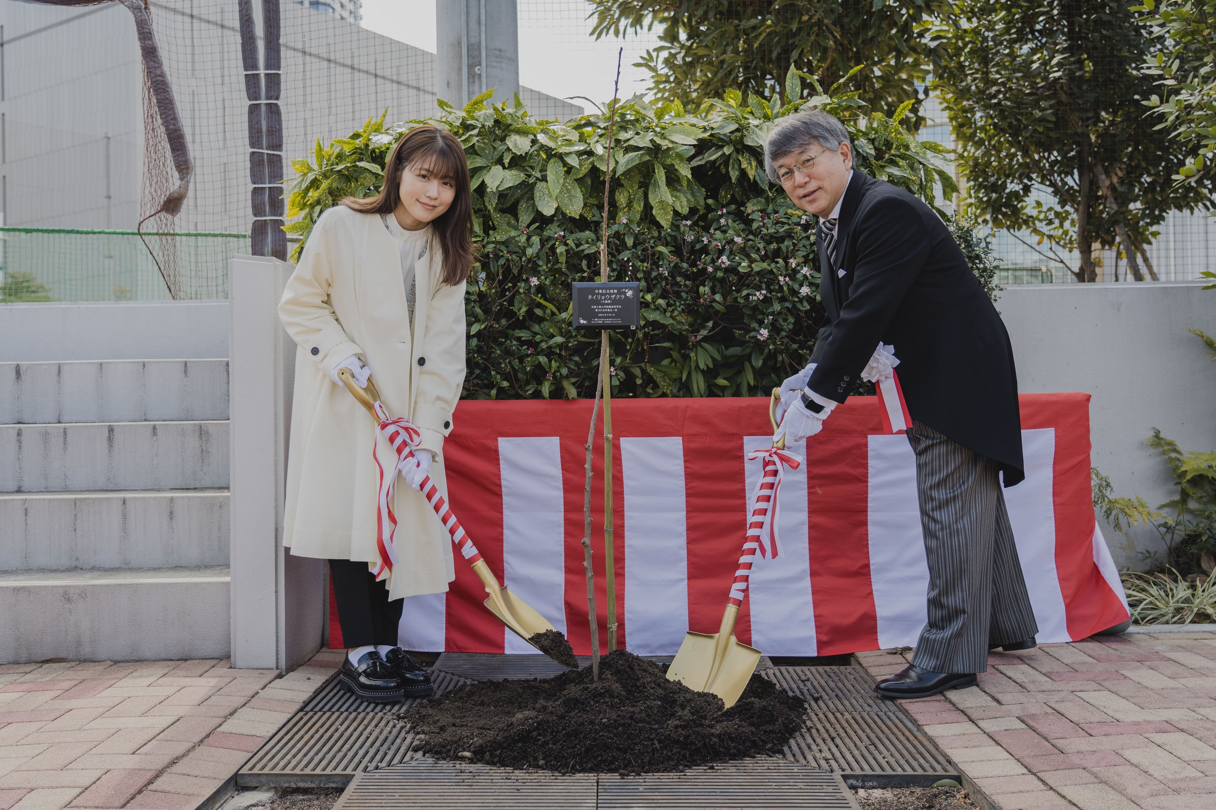 今回ご応募いただいた1,583校の中から、創立100周年を迎える芝浦工業大學附属高等学校が抽選で選ばれ、伊藤園のCMキャラクターを務める有村架純さんがサプライズゲストとして登場し、祝辞と桜の記念植樹を行いました。