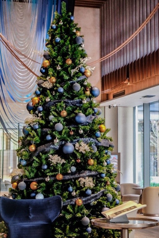 クリスマスは家族や友⼈が集まり、⼼温まる時間を過ごす特別な期間です。デュシタニ京都でのクリスマスツリーが藍⾊・ネイビーブルーで彩っている理由は、この穏やかで温かな時間を内外のお客様に深く感じていただくために選定いたしました。藍色は心の平和と静けさを、ネイビーブルーは信頼と強さを象徴し、これらの⾊は、静かな冬の夜に相応しい⾊調として、ゲストがリラックスし、和やかな気持ちで特別な時を過ごせるようにとの思いを込めております。