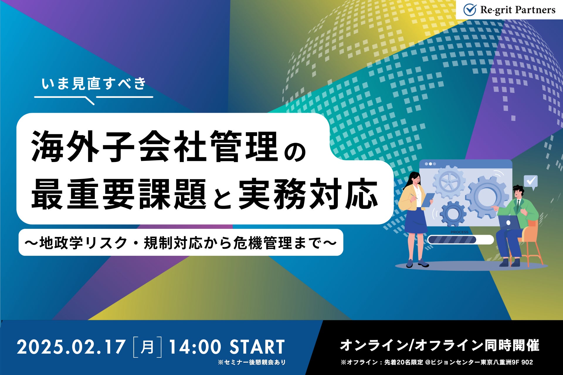 株式会社Re-grit Partners(本社:東京都千代田区紀尾井町1-3 東京ガーデンテラス紀尾井町 紀尾井タワー13階、代表:山木 智史、以下、「当社」)と株式会社JPリサーチ&コンサルティング(本社:東京都港区虎ノ門3丁目7番12号 虎ノ門アネックス6階、代表:古野啓介氏)は、【いま見直すべき海外子会社管理の重要課題と実務対応~地政学リスク・規制対応から危機管理まで~】を共同開催する運びとなりましたので、ご案内致します。
