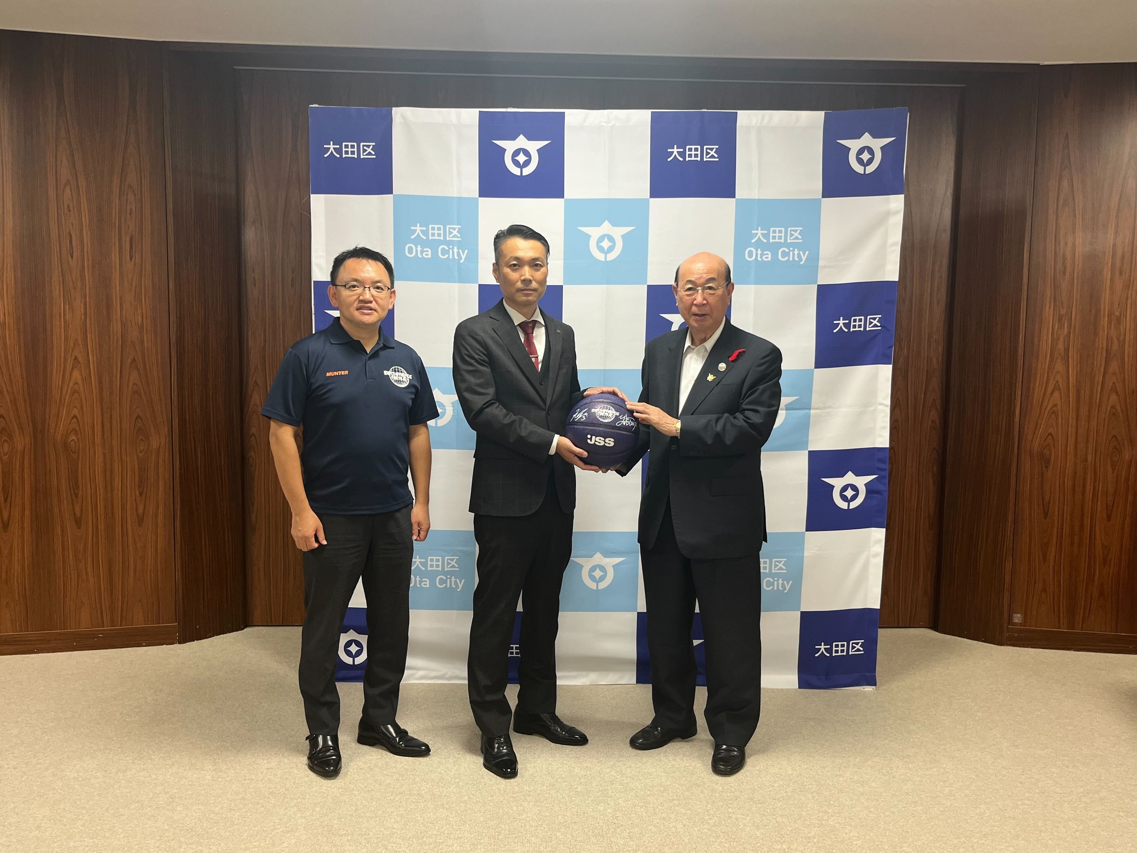 松原区長からは、『アースフレンズ東京Zは、平成24年から大田区をホームタウンとして活動されており、多くの区民が応援しているのでますます頑張っていただきたい。また、スポーツと健康、特に心身ともに健康であるということは人生においてとても大切なこと。寄贈いただいたき感謝している』との言葉をいただきました。