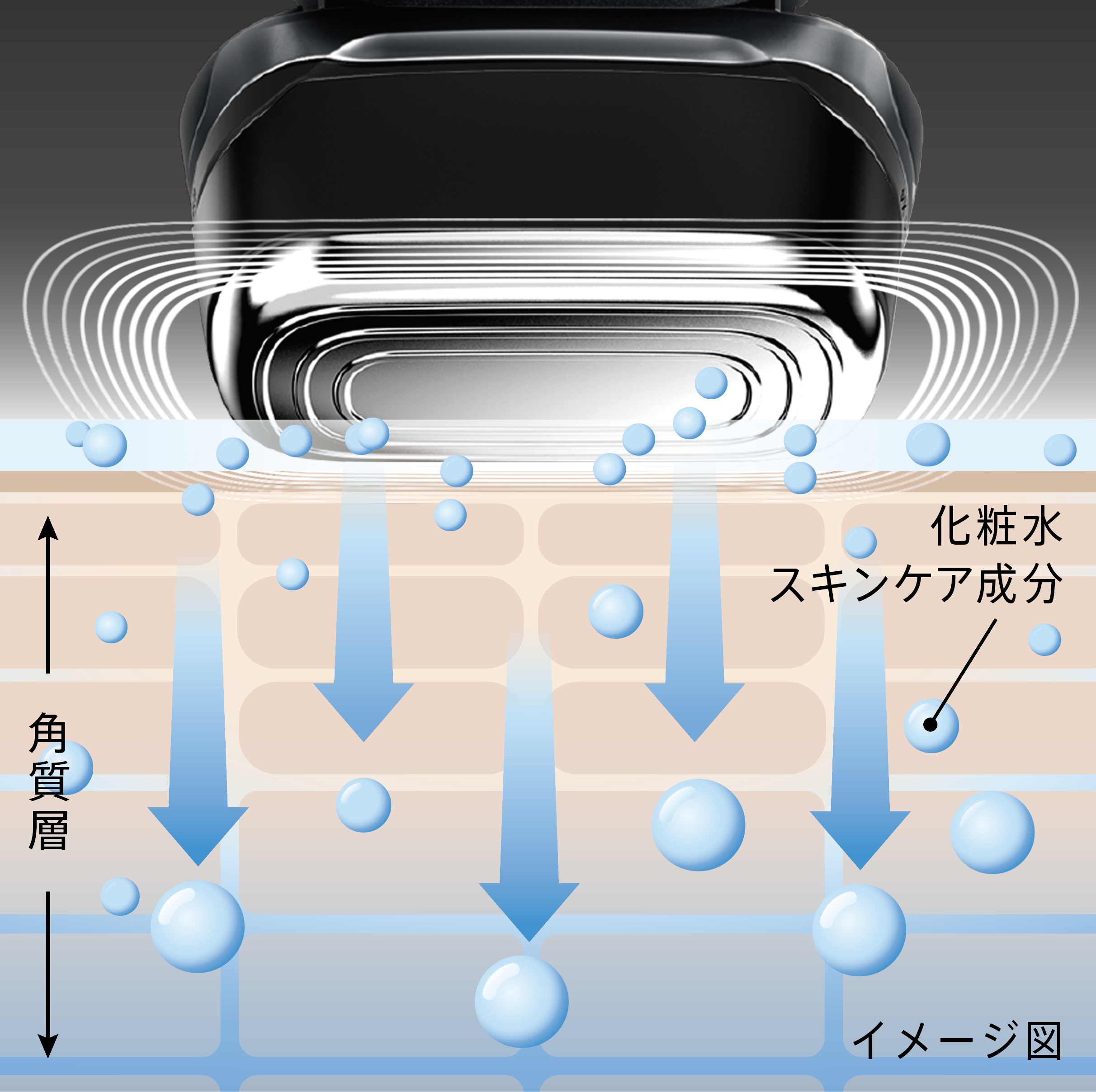 美顔器ヘッドから発生する磁力が化粧水成分に作用して起こる磁力の反発と毎分10000回のシェーバーの振動により、