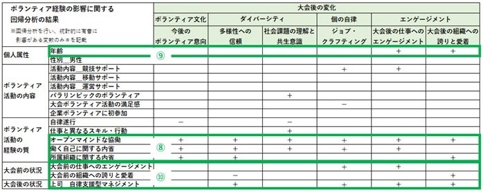 ・企業人の年齢が高いほど、大会ボランティア参加後に、「仕事へのエンゲージメント」や「(所属)組織への誇りと愛着」が上昇する(⑨)。同じ活動・経験をしても、年齢によって影響が異なることに留意がいる。