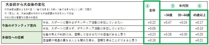 ・年齢が若い企業人は、「今後のスポーツボランティア意向」(34歳以下0.47点上昇)や「他者の考えや判断には、信頼して任せるだけの価値がある」(34歳以下0.28点上昇)が、大会前から大きく上昇する(⑤)。