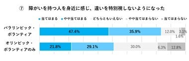 パラリンピック・ボランティア参加者の83.3%が、大会後に「障がいを持つ人を身近に感じ、違いを特別視しないようになった」と回答(⑦)。