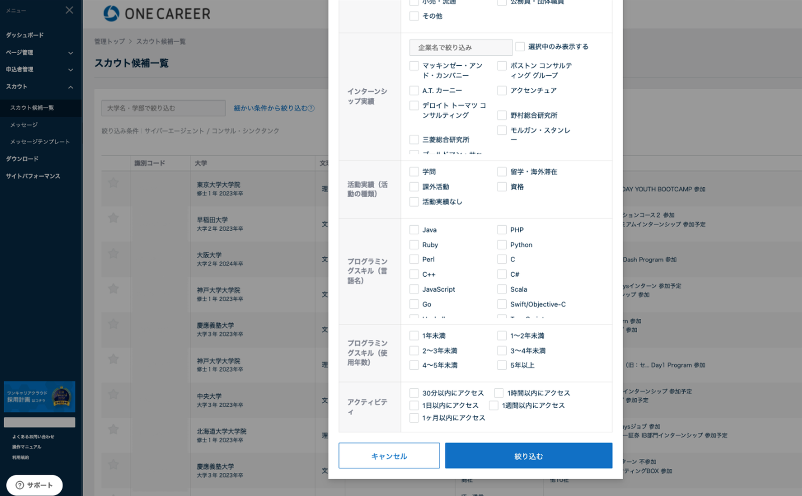 「ONE CAREER CLOUDスカウト」では、大学・学部・志望業界・プログラミングスキルなどはもちろん、インターンシップ実績(個社名)でも学生検索が可能です。また、ONE CAREER上で「自社にお気に入り登録をしている学生」(※3)に絞り込むことも可能。リーチしたい学生を探しやすいのが特徴です。