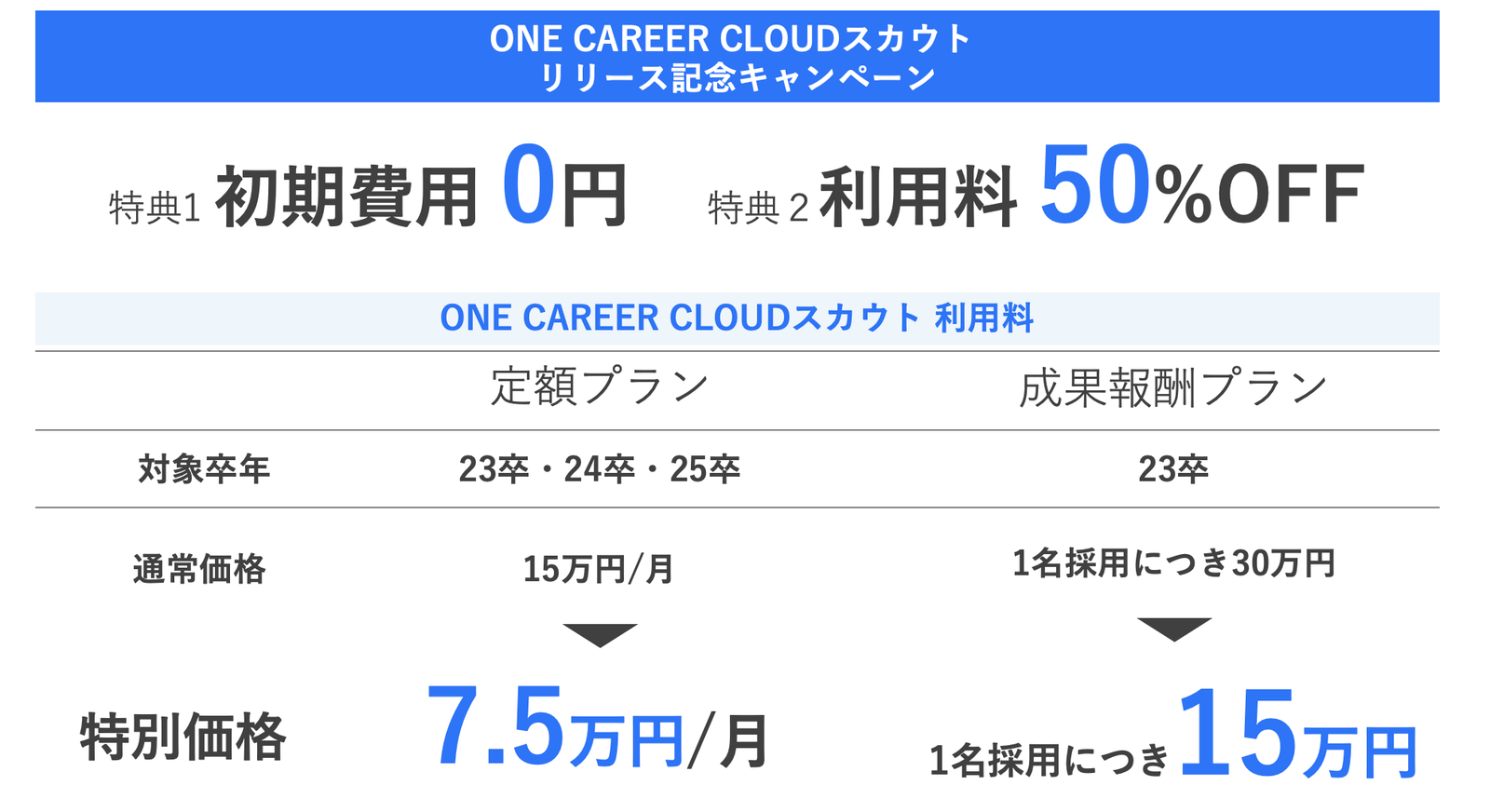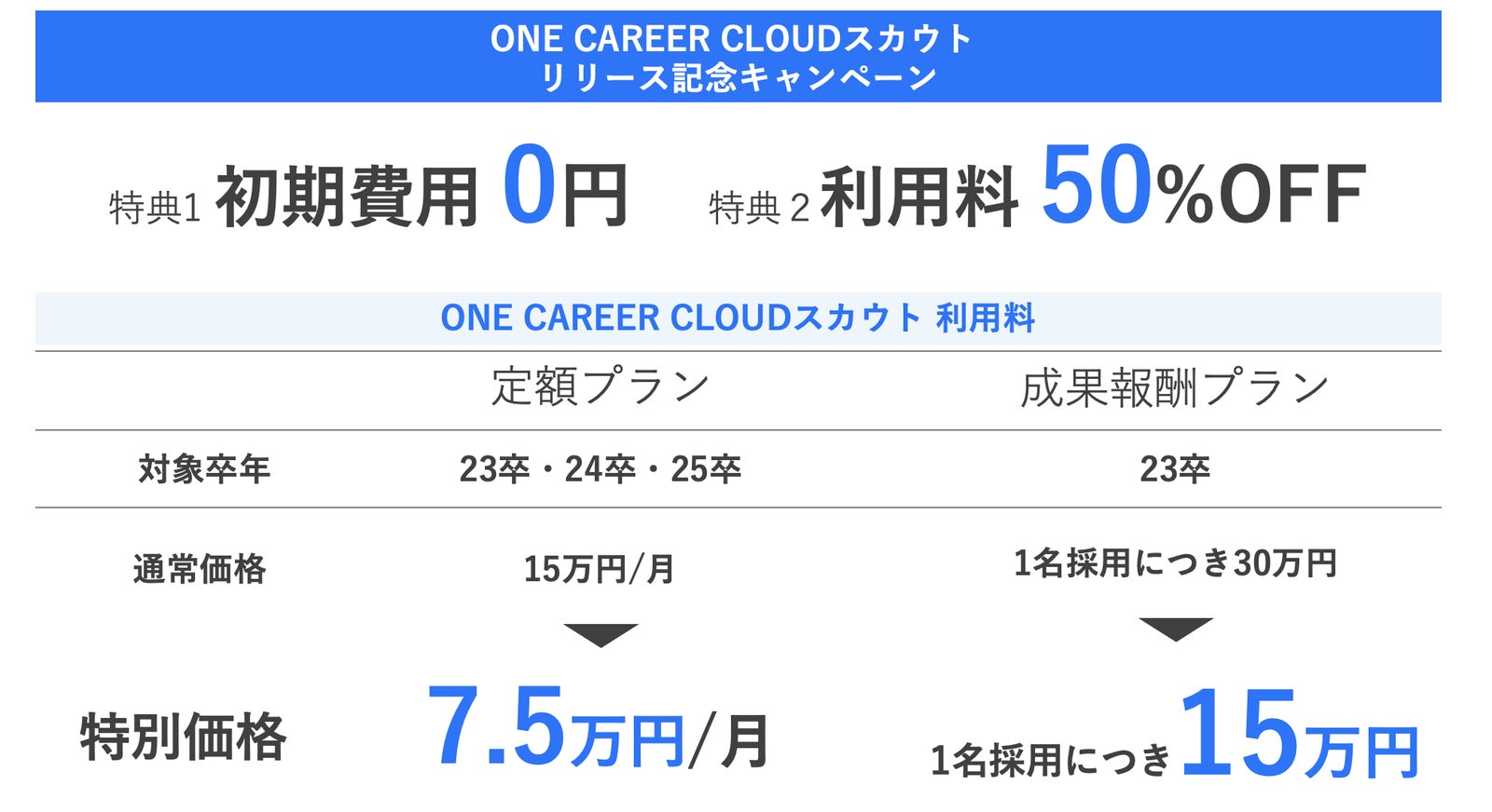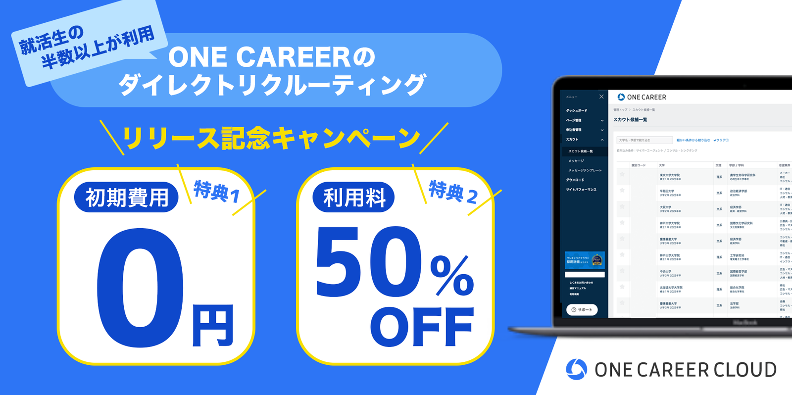 はじめてのキャリアを選ぶ、就活サイト「ONE CAREER」を運営する株式会社ワンキャリア(本社:東京都渋谷区、代表取締役 宮下尚之、以下ワンキャリア)はダイレクトリクルーティングサービス「ONE CAREER CLOUDスカウト」を本日リリースしたことを発表します。本サービスでは、就活生の半数以上が利用している「ONE CAREER」登録学生へスカウトを通じて直接アプローチが可能です。また「リリース記念キャンペーン」として本サービスを「初期費用0円」&「利用料50%OFF」でご提供します。