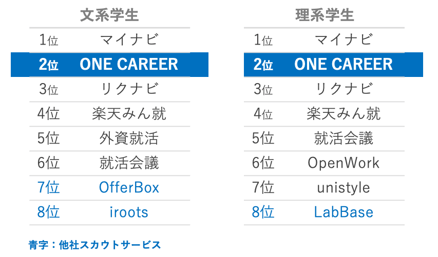 はじめてのキャリアを選ぶ、就活サイト「ONE CAREER」は、新卒入社までの最初のキャリア選択をサポートするサービスです。企業の採用活動に関する50万件を超える就職活動の体験情報を集め、1万社を超える企業のキャリアデータを蓄積しています。新卒領域において就職活動の情報収集・分析ツールとして多くの学生に支持され、2人に1人以上の学生に利用いただき、2022年卒学生が1年を通して最も利用した就職サイトランキングで2位を獲得しております。