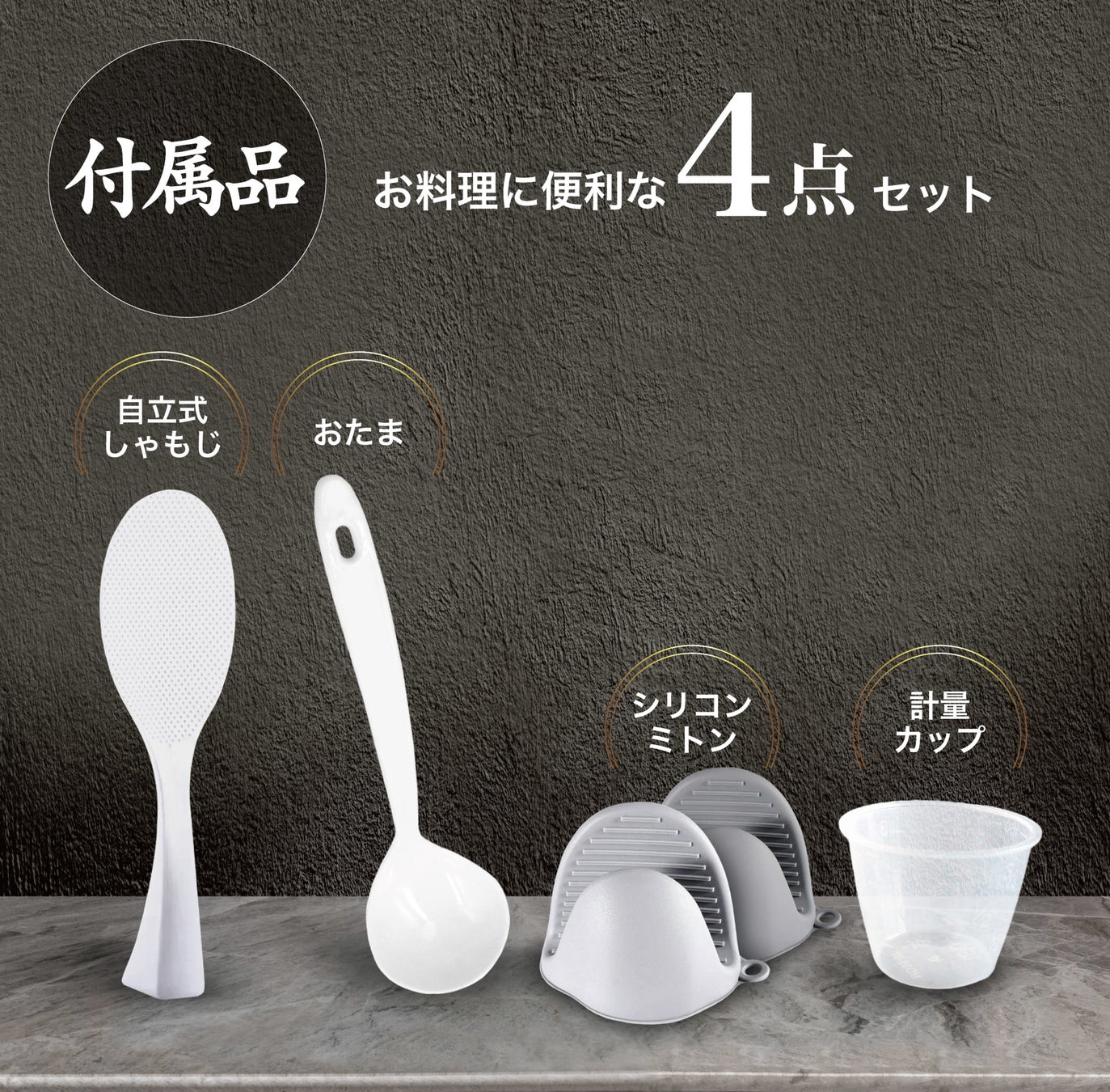 付属品:しゃもじ、おたま、シリコンミトン、計量カップ