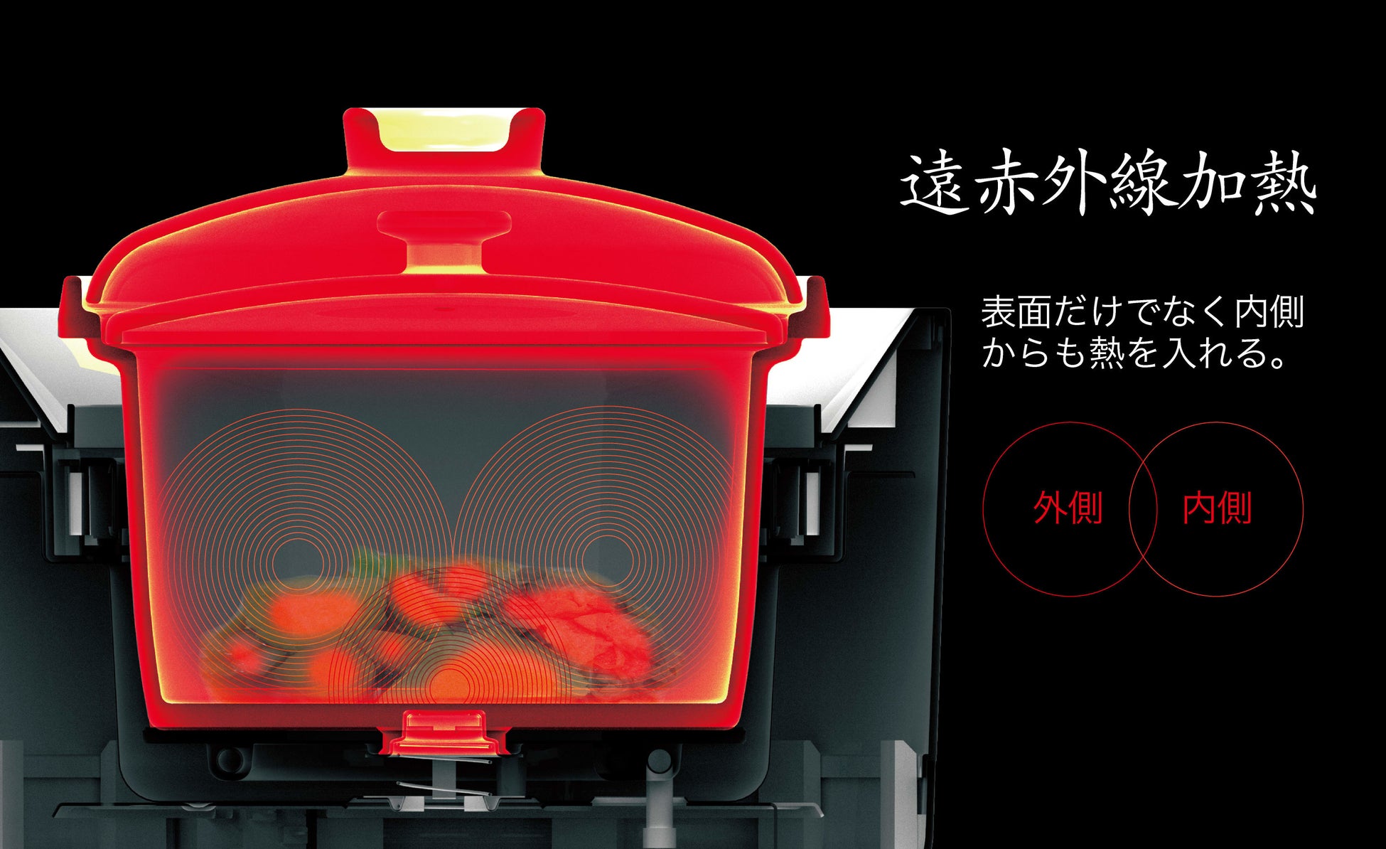 1000℃で焼きあげた独自の土鍋釜と、360度全方位から均一に加熱する本体構造と遠赤外線効果により、ふっくらとしたお米とおこげを美味しくお召し上がりいただけます。