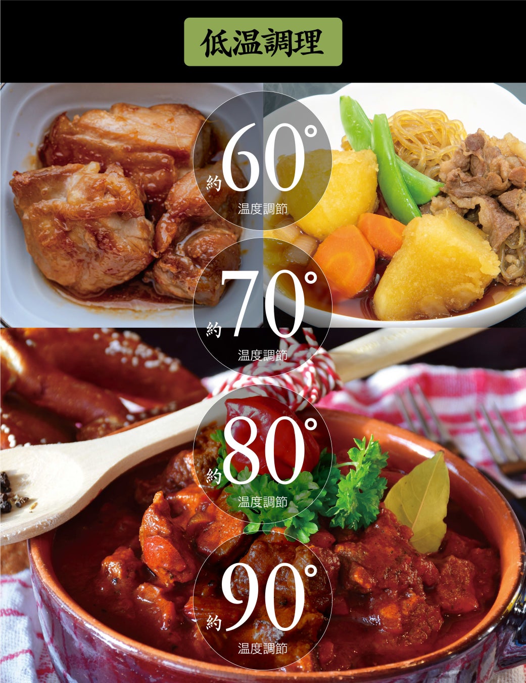 ③6つの調理モードで多彩調理!独自の低温調理モードは60℃、70℃、80℃、90℃に温度設定可能