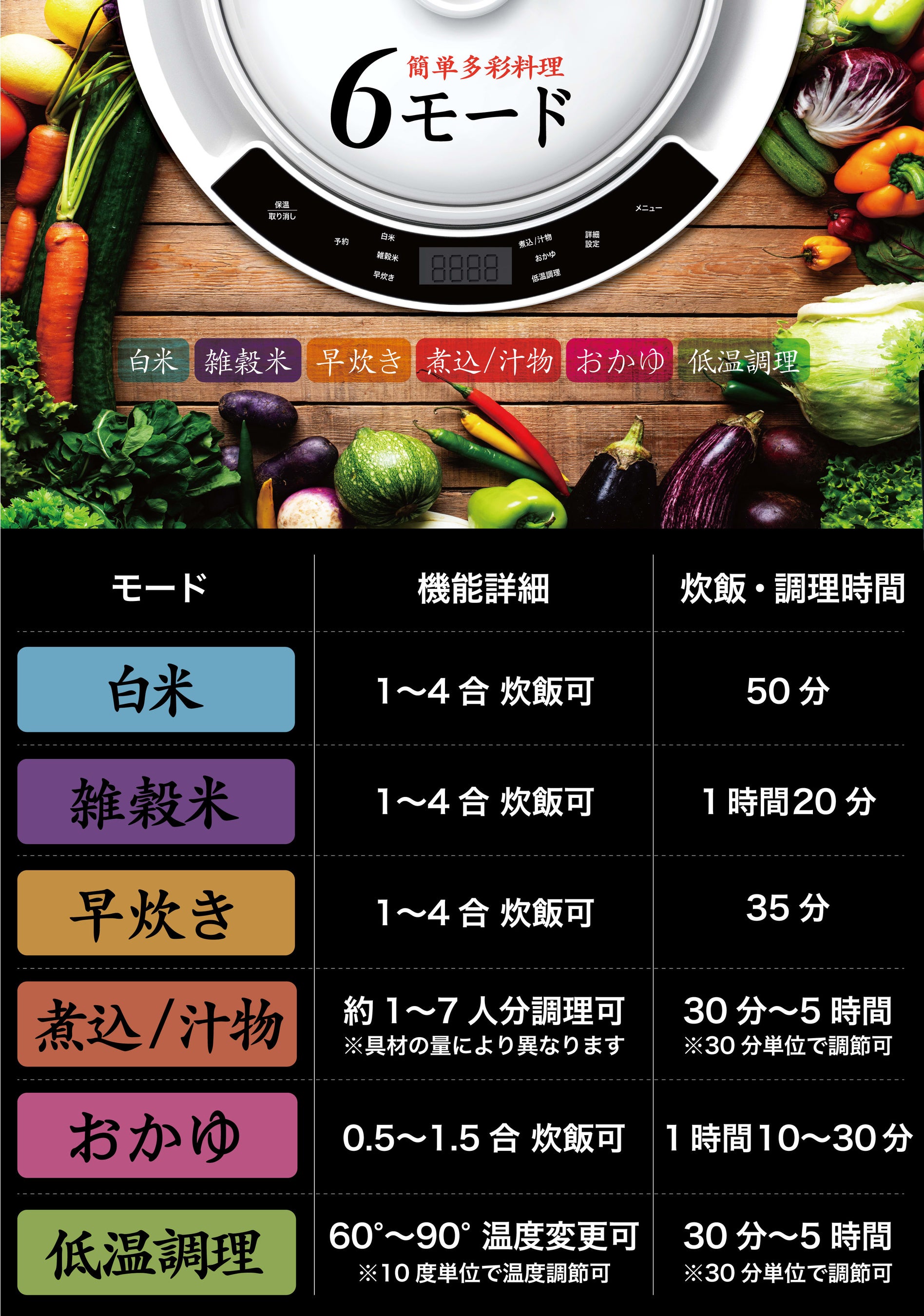 白米はもちろん、雑穀米、早炊き、煮込/汁物、おかゆ、低温調理も1台で調理することができるので、毎日の食事の強い味方になってくれること間違いありません!
