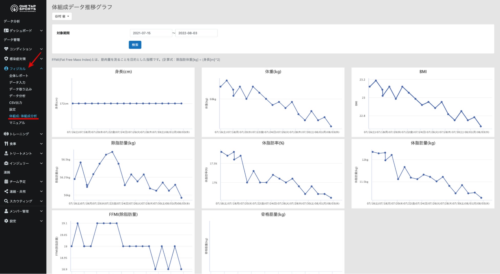 タニタの「業務用マルチ周波数体組成計」からエクスポートされたデータをONE TAP SPORTSに取り込み、グラフ表示するデータは、身長、体重、BMI、除脂肪量、体脂肪率、体脂肪量、FFMI(除脂肪量)です。