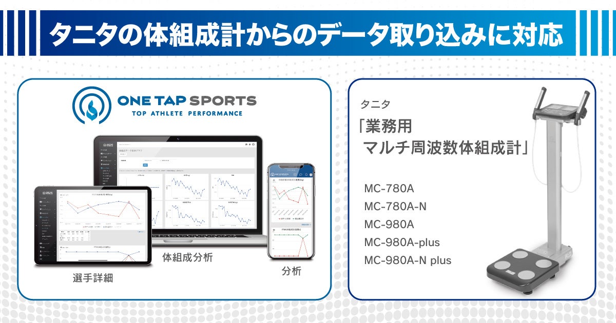体組成データについては、以前よりInBody社(株式会社インボディ・ジャパン)製品とONE TAP SPORTSのデータ連携を行っていましたが、今回新たに、タニタの「業務用マルチ周波数体組成計」5機種に対応しました。これにより、アスリートやチームにとって、幅広い競技における身体づくりの基礎となる体組成データを蓄積・可視化するための選択肢が広がります。