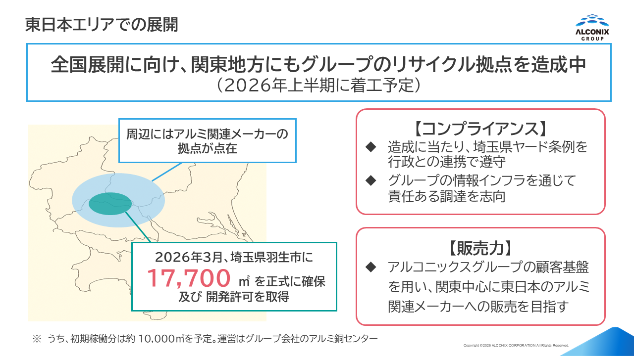 なお、造成・運営にあたっては、埼玉県の「埼玉県特定再生資源屋外保管業の規制に関する条例」(埼玉県ヤード条例)に則り、県が定めるヤードの建設・運営に関するルールを遵守できるよう、行政と連携しております。さらに、アルコニックスグループの情報インフラを活用し、責任ある調達を行うための仕組みづくりにも取り組むことで、これは、将来のお取引先様にとっても、安心して調達できるリサイクル拠点を整備してゆきます。