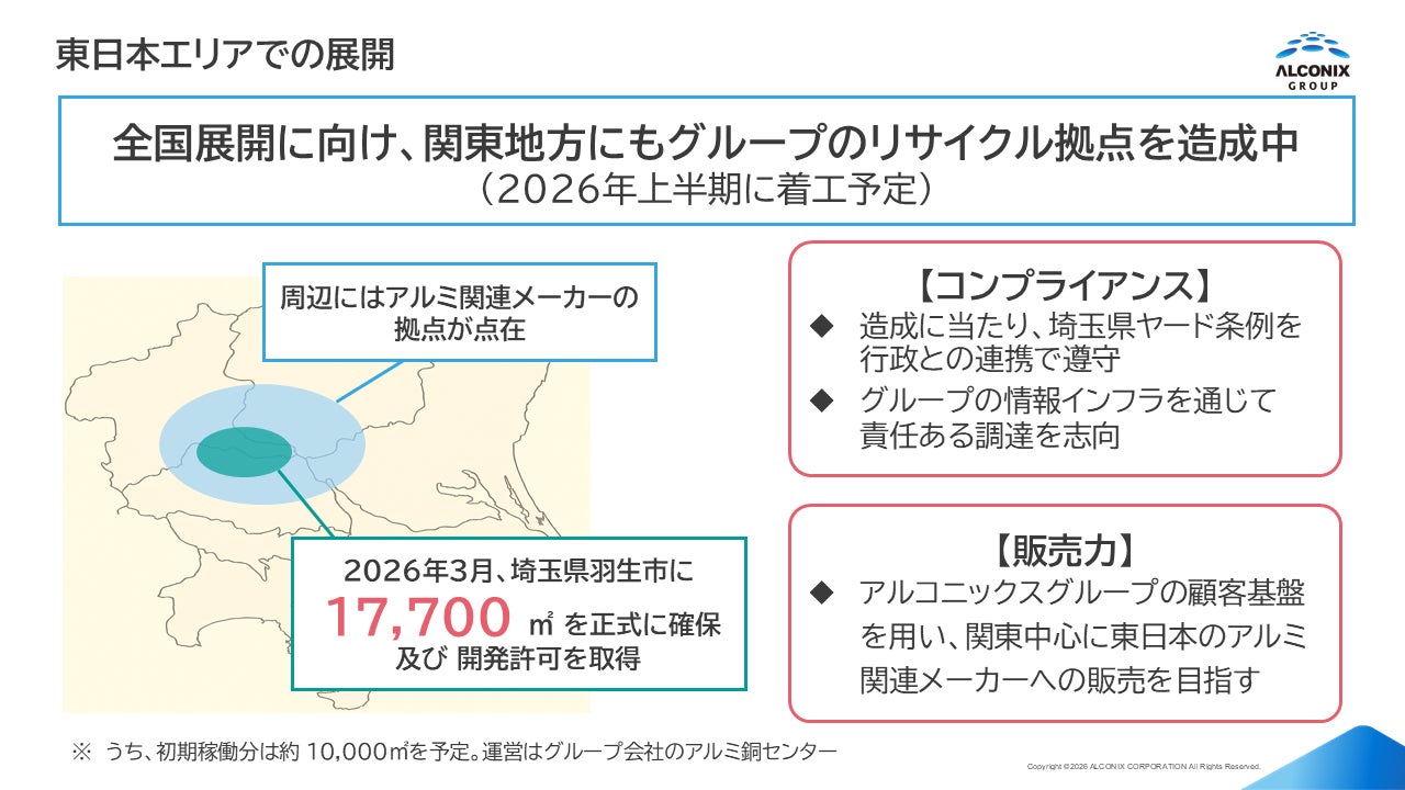 近年、日本では、地政学リスクの高まりや脱炭素化の要請を背景として、資源を国内で循環させる仕組みづくりの重要性が高まっています。2026年4月1日に施行された改正資源有効利用促進法をはじめ、再生資源の利用促進や原材料等の再資源化を後押しする制度整備も進められており、サーキュラーエコノミー(循環経済)の実現に向けた社会的要請は一層強まっています。こうした中、アルコニックスグループは、非鉄金属資源の国内循環を支える拠点整備を進めています。非鉄金属スクラップの回収・選別・保管というインフラ機能へ投資することで、脱炭素促進・環境負荷の低減に加え、重要資源の安定供給基盤の強化にも貢献してまいります。特に、関東圏は非鉄金属スクラップの一大発生地であり、本件の造成地である羽生市周辺には潜在的な需要家であるアルミ関連メーカーが拠点を構えております。そこで、東日本エリアでのリサイクル事業を戦略的に強化するべく、本件の造成を決定しました。