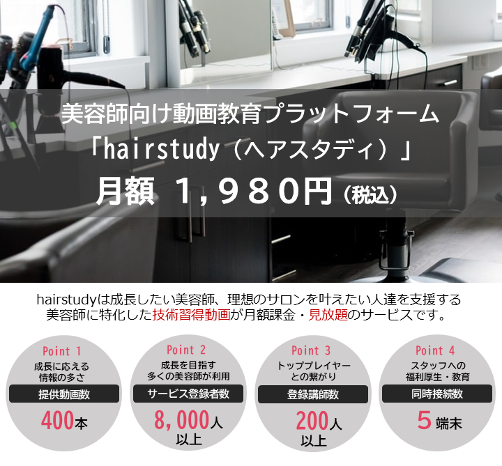 「hairstudy」はトップクラスの美容師130名以上が講師として登録し、400本の学習効率にこだわったプロ美容師専用の動画コンテンツを、月額課金・見放題で提供する日本最大級の美容師/美容室向けオンライン動画教育プラットフォームです。