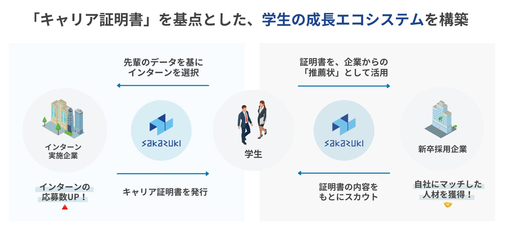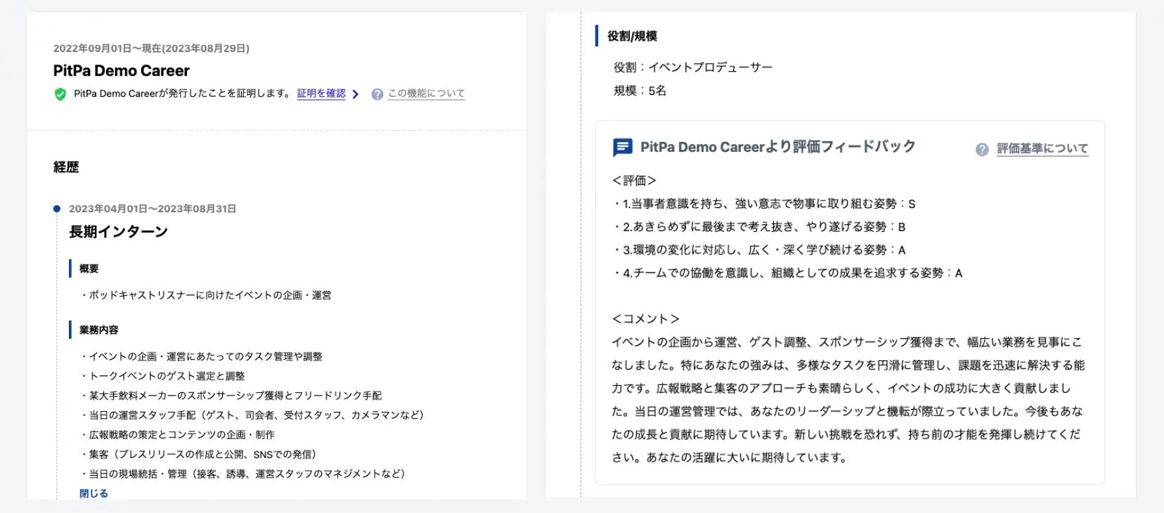 また企業側にとっても、証明書の発行を通じて学生をアトラクトできるほか、たとえインターン参加者が他社へ就職した場合でも、質の良いフィードバックと参加者の就職先情報を「キャリア証明書」を通じて公開することで、「この会社のインターンシップに参加することで成長が見込める」という認知を形成し、これまでリーチできなかったコミュニティや大学から、新たな人材を獲得することも可能です。
