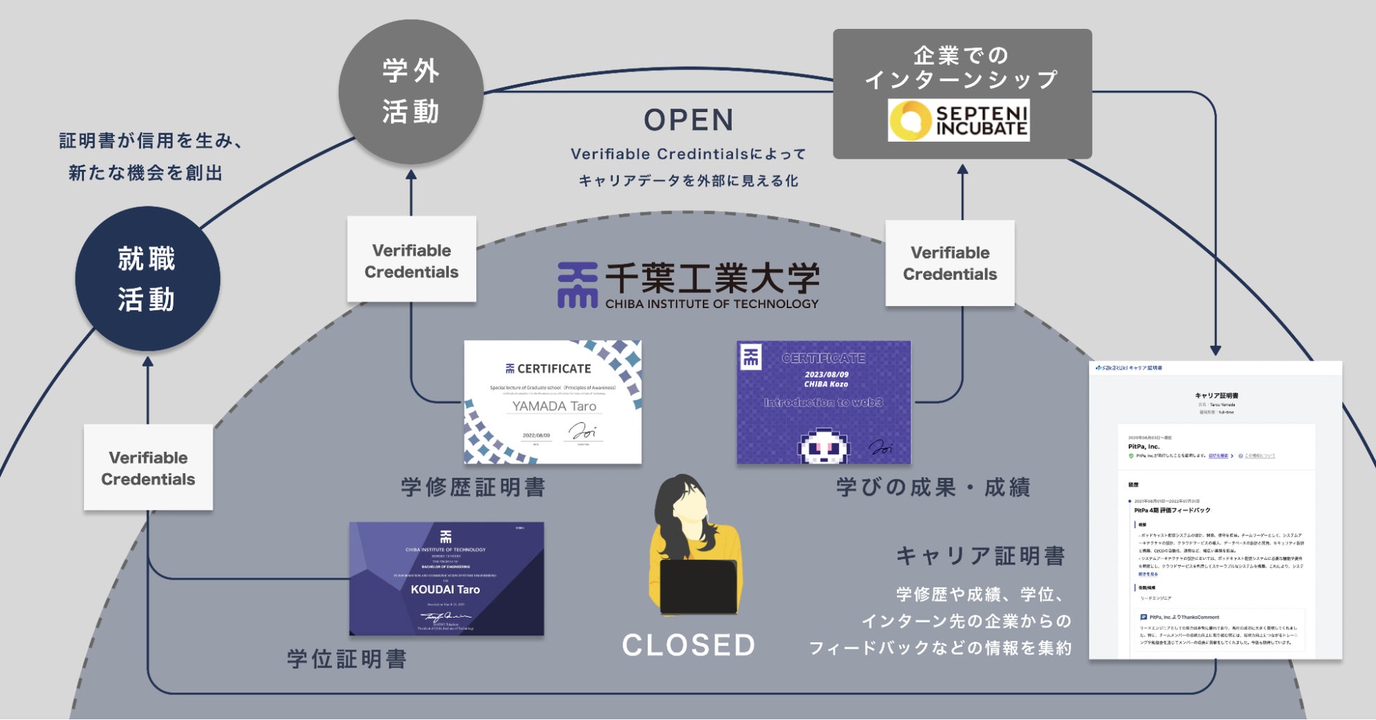 私たちDOUは、2022年より千葉工業大学と共同で、NFTやVerifiable Credentials(以下、VC)などの先端技術を活用し、学生が自らのキャリアをより主体的に選択できる環境の構築を目指して、様々な取り組みを展開して参りました。