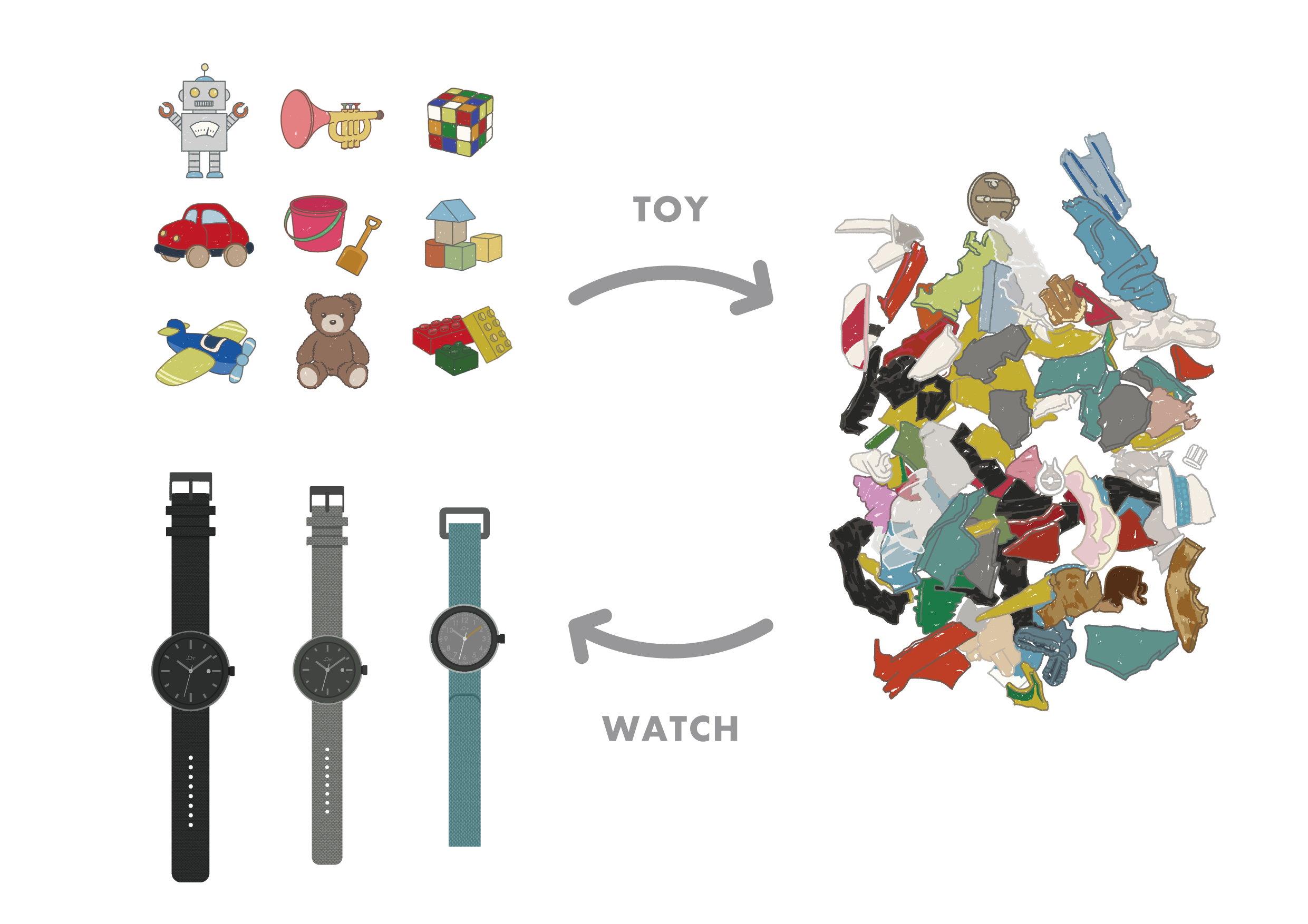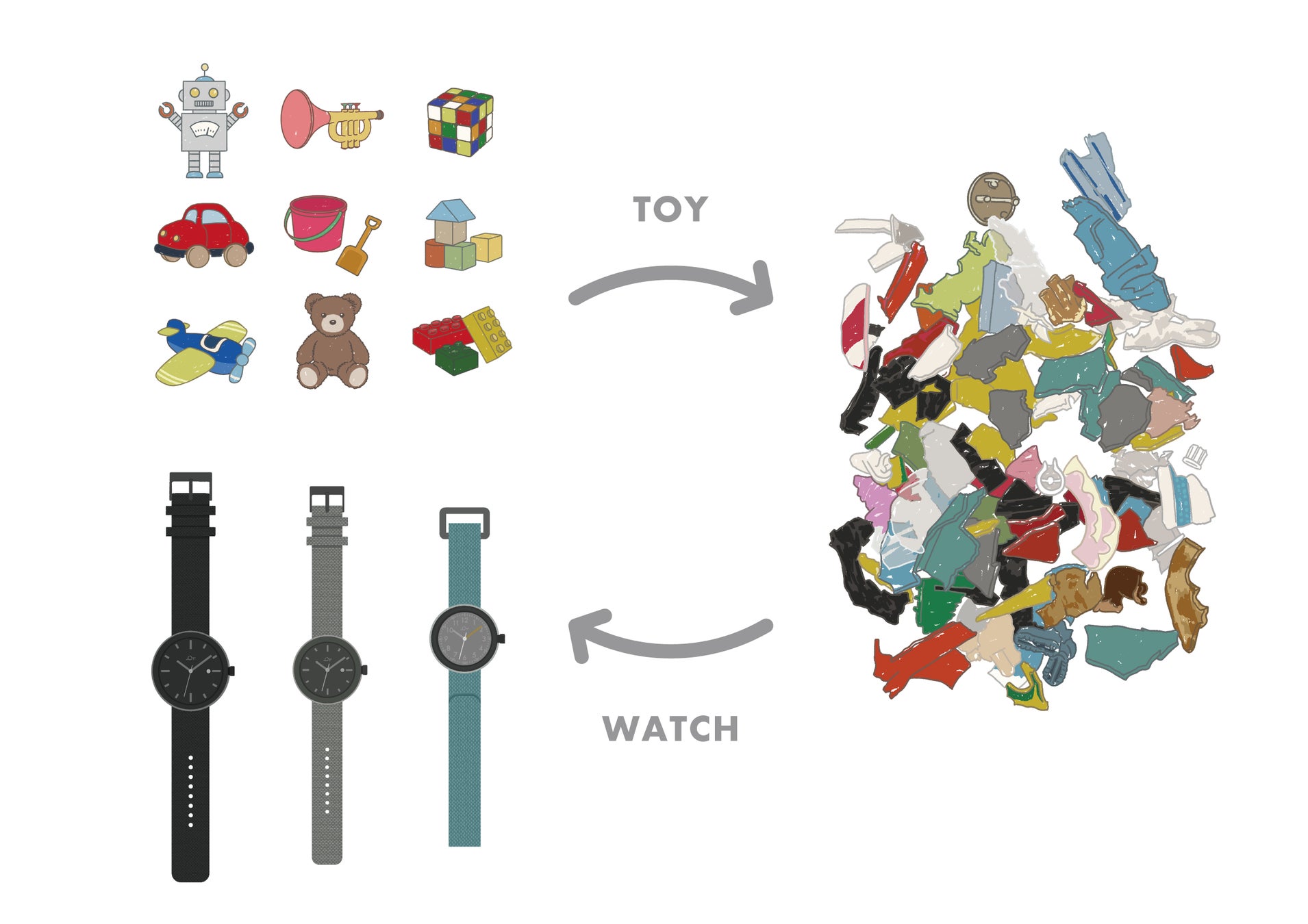YOT WATCHは市場で回収されたプラスチックのおもちゃをリサイクルした原料からできています。