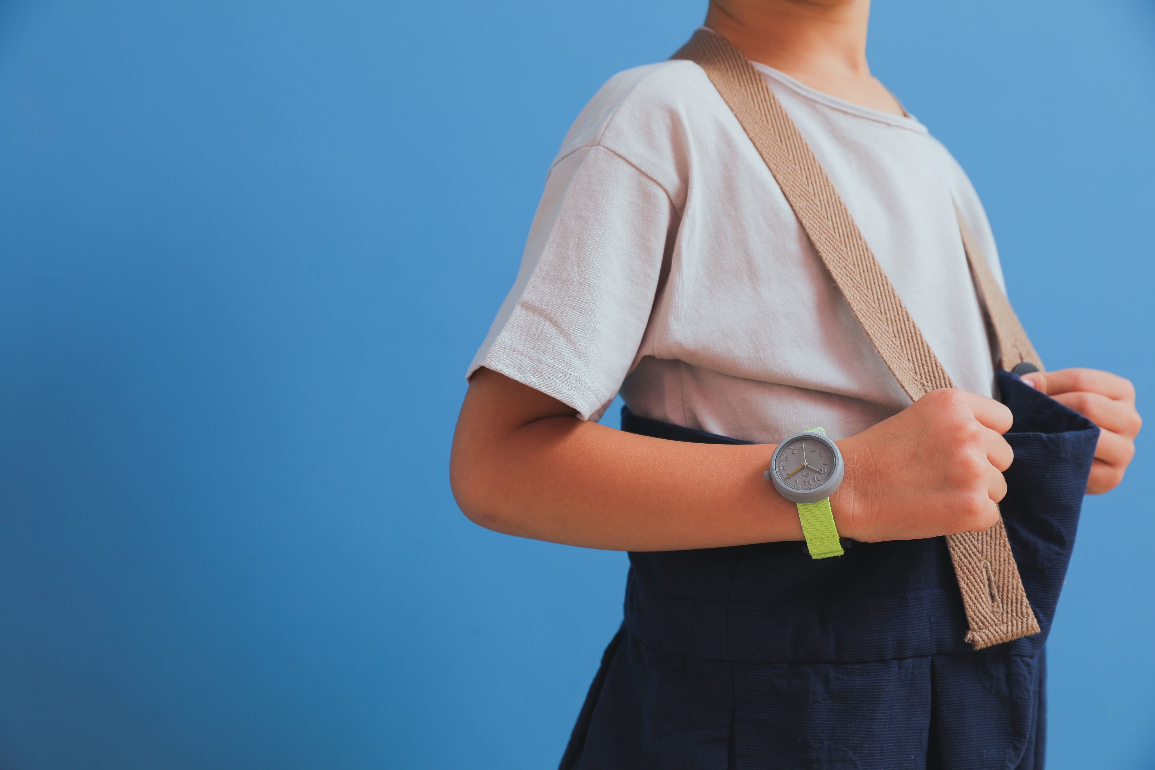 デザインは、大人でもこどもでも使いやすいシンプルなデザインとしながらも、こども用には時計を読みやすいように文字盤に数字を付けたり、分針の色を変える工夫を加えています。