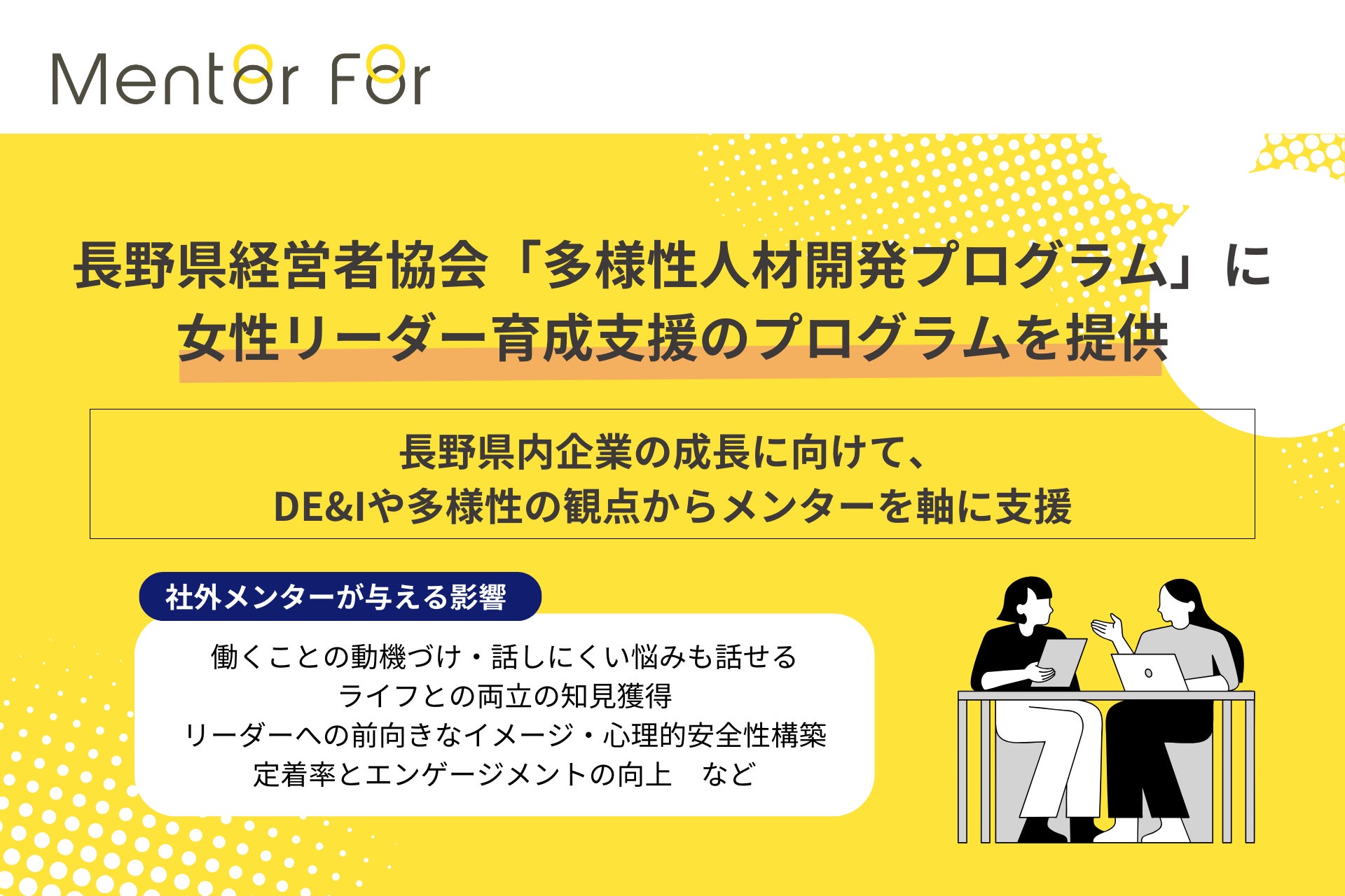 企業のDE&I(Diversity, Equity & Inclusion)・女性活躍推進を目的とした、社外メンターの育成・マッチング・社内メンター制度支援を提供する株式会社Mentor For(東京都品川区、代表取締役CEO・池原真佐子、以下Mentor For)は、一般社団法人 長野県経営者協会(長野県長野市、会長・碓井 稔、以下長野県経営者協会)による事業「多様性人材開発プログラム」に参加いたします。「多様性人材の育成」を人材戦略として取り組む長野県内の企業に向けて、女性リーダー育成支援のプログラムを提供いたします。