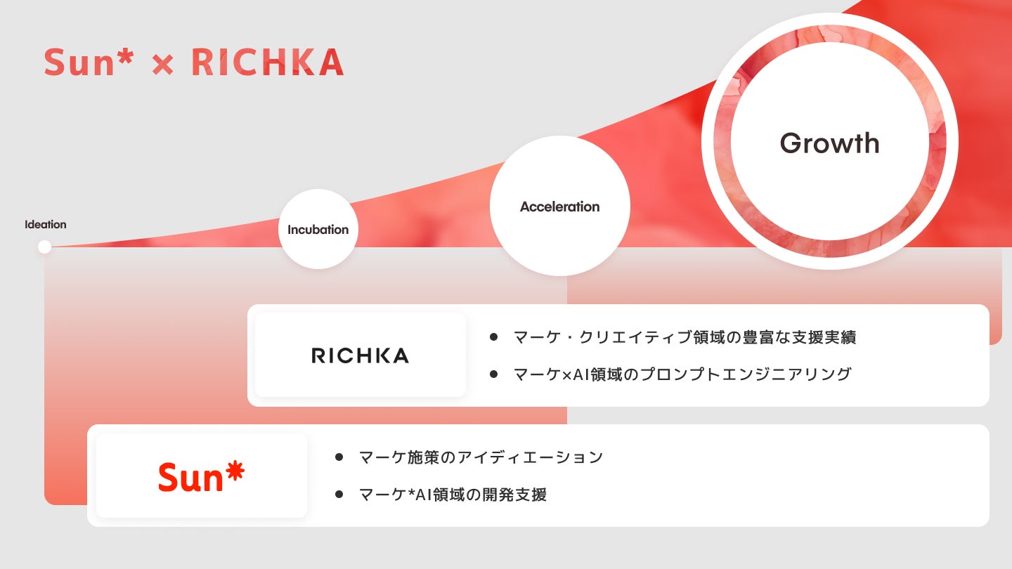 今回の連携は、リチカ社が提供するマーケティング×生成AIのプロジェクト(*1)において、主にアイディエーションや開発面でSun*が協働することにより、一気通貫した事業推進・価値創造を可能にするものであり、Sun*はこのパートナーシップを通じて、マーケティング・コミュニケーション領域におけるクライアントの事業支援も強化していきます。