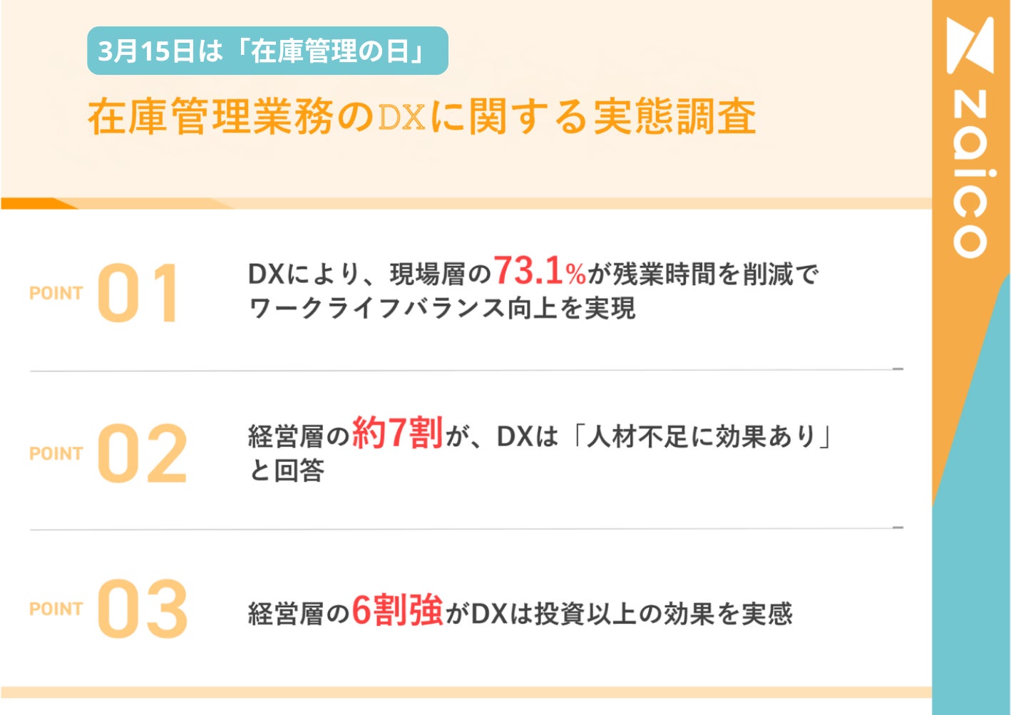 今回の調査では、在庫管理業務のDXが業務効率化だけでなく、従業員のワークライフバランスや働きがいの向上にも大きく寄与していることが明らかになりました。