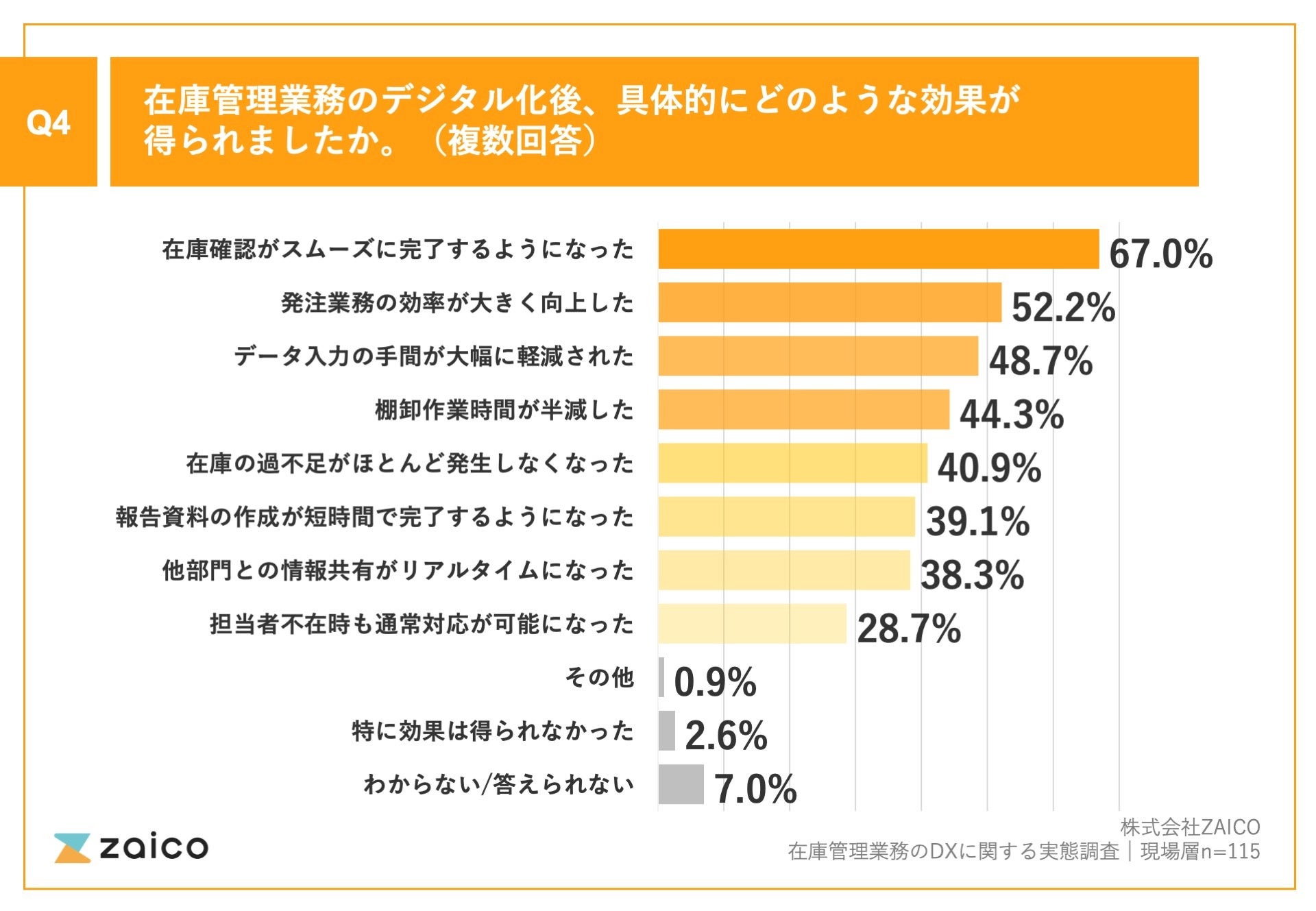 「Q4.在庫管理業務のデジタル化後、具体的にどのような効果が得られましたか。(複数回答)」(n=115)と質問したところ、「在庫確認がスムーズに完了するようになった」が67.0%、「発注業務の効率が大きく向上した」が52.2%、「データ入力の手間が大幅に軽減された」が48.7%という回答となりました。