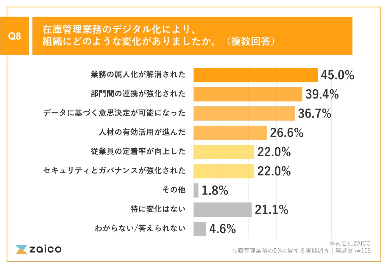 「Q8.在庫管理業務のデジタル化により、組織にどのような変化がありましたか。(複数回答)」(n=109)と質問したところ、「業務の属人化が解消された」が45.0%、「部門間の連携が強化された」が39.4%、「データに基づく意思決定が可能になった」が36.7%という回答となりました。