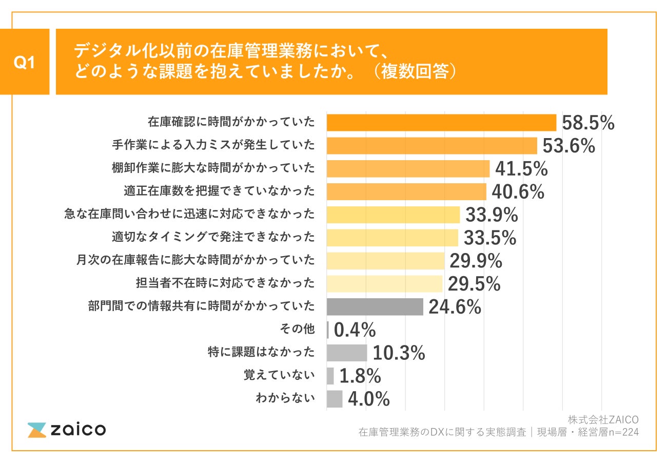 「Q1.デジタル化以前の在庫管理業務において、どのような課題を抱えていましたか。(複数回答)」(n=224)と質問したところ、「在庫確認に時間がかかっていた」が58.8%、「手作業による入力ミスが発生していた」が53.6%、「棚卸作業に膨大な時間がかかっていた」が41.5%、という回答となりました。