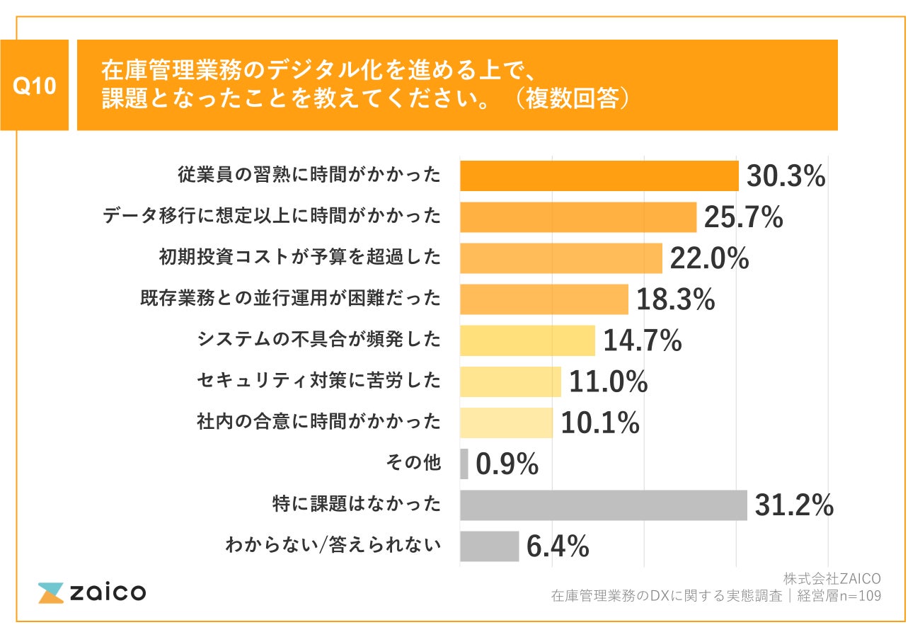 「Q10.在庫管理業務のデジタル化を進める上で、課題となったことを教えてください。(複数回答)」(n=109)と質問したところ、「従業員の習熟に時間がかかった」が30.3%、「データ移行に想定以上に時間がかかった」が25.7%、「初期投資コストが予算を超過した」が22.0%という回答となりました。