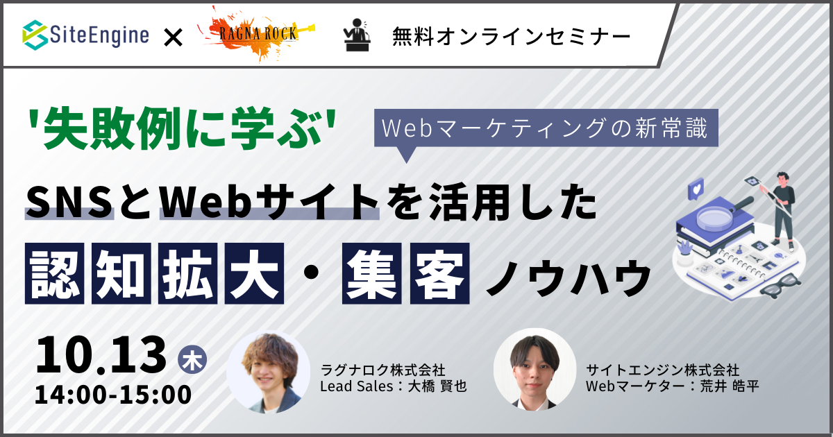ラグナロ ク株式会社(本社:東京都渋谷区 代表取締役:⻄本 誠)は、2022年10月13日(木)14:00〜15:00に、「自己表現にテクノロジーとアイデアを」を経営理念としてWebマーケティング支援サービスを提供する、サイトエンジン株式会社との "【Webマーケティングの新常識】失敗例に学ぶ SNSとWebサイトを活用した認知拡大・集客ノウハウ" を公開するセミナーを開催いたします。