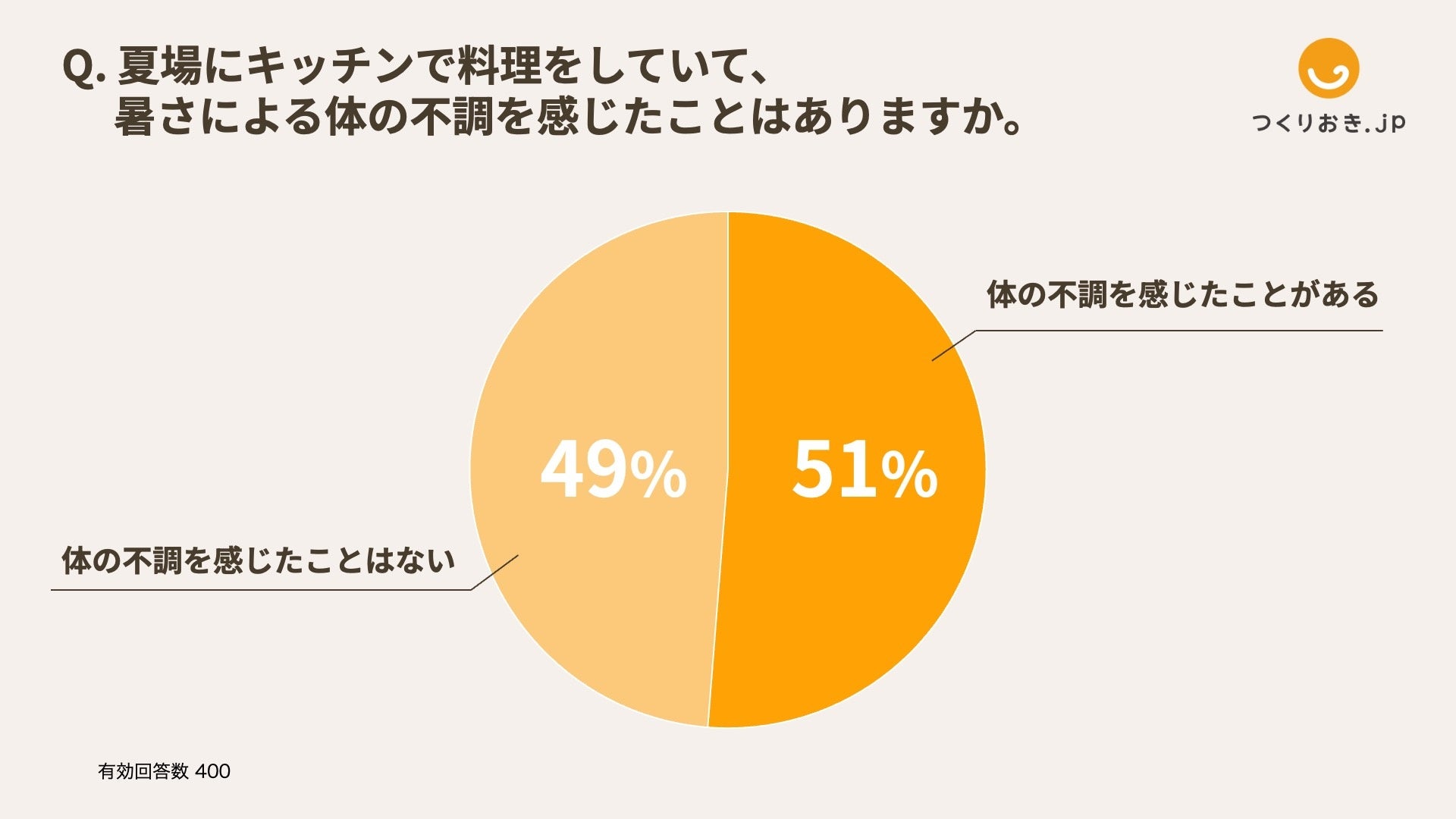 夜間、寝ている間に熱中症になる危険性については広く知られるようになりましたが、寝室以外でも熱中症になるリスクがあります。「夏場にキッチンで料理をしていて、暑さによる体の不調を感じたことはありますか」という質問に対して、2人に1人が「体の不調を感じたことがある」と回答しました。