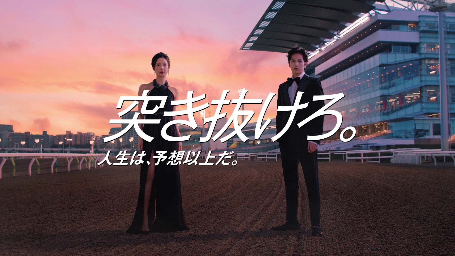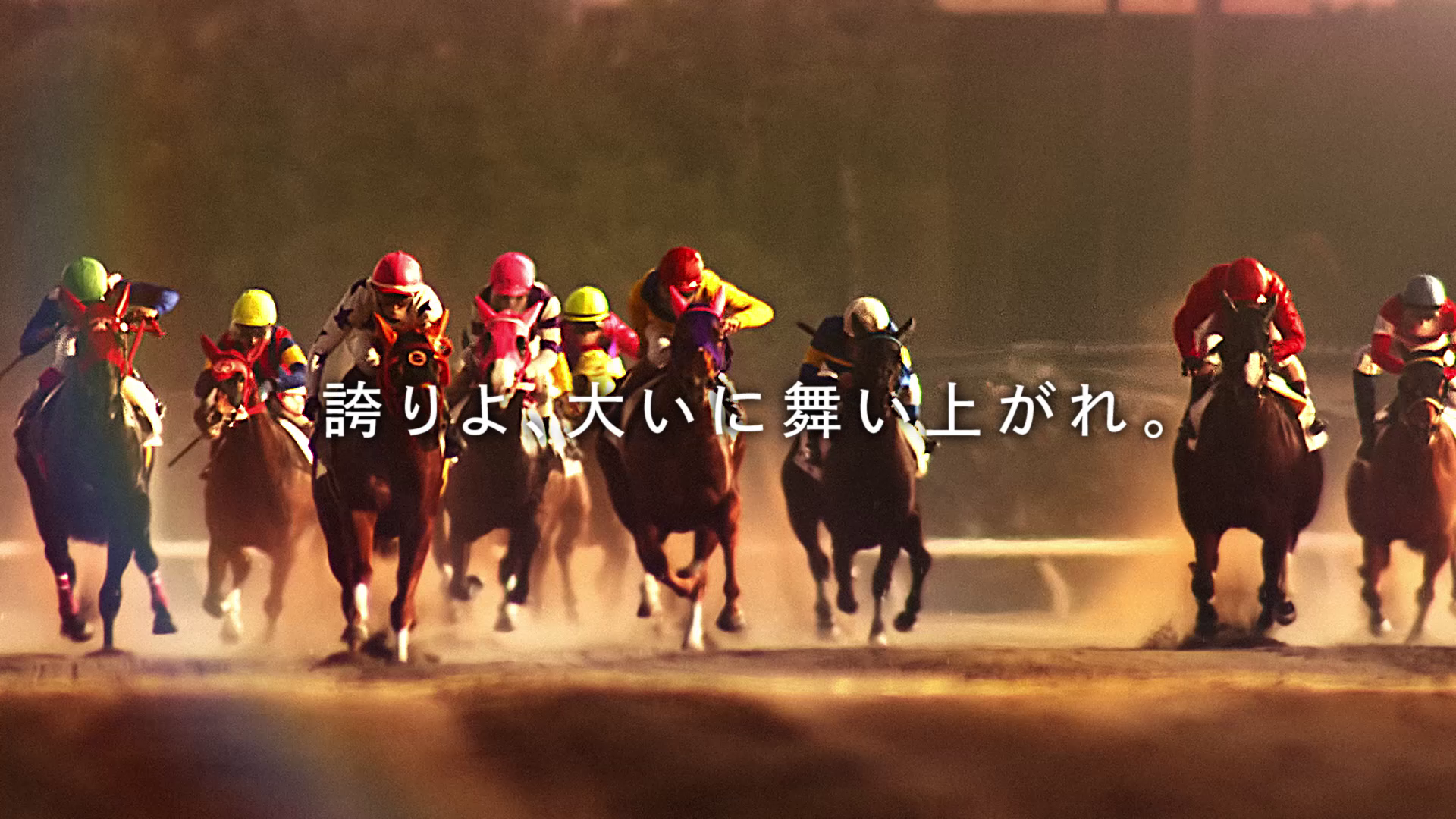 お二人が「いよいよ」「ですね。」と言い、扉を開くと光が差し、「誇りよ、大いに舞い上がれ。」の文字と共に力強く駆け抜ける競走馬が現れます。ラストカットでは、馬場に降り立ったお二人が、今年のテーマ「突き抜ろ。TCK 」と力強く語りかけます。