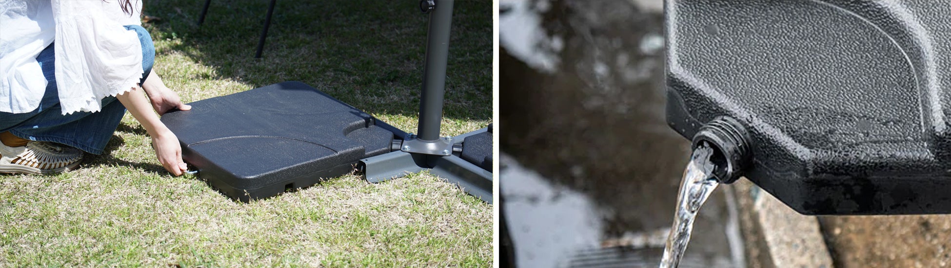 ↑ご使用の際には、必ず付属の樹脂ベースに水を入れて土台に設置してから、パラソルを立ててください。