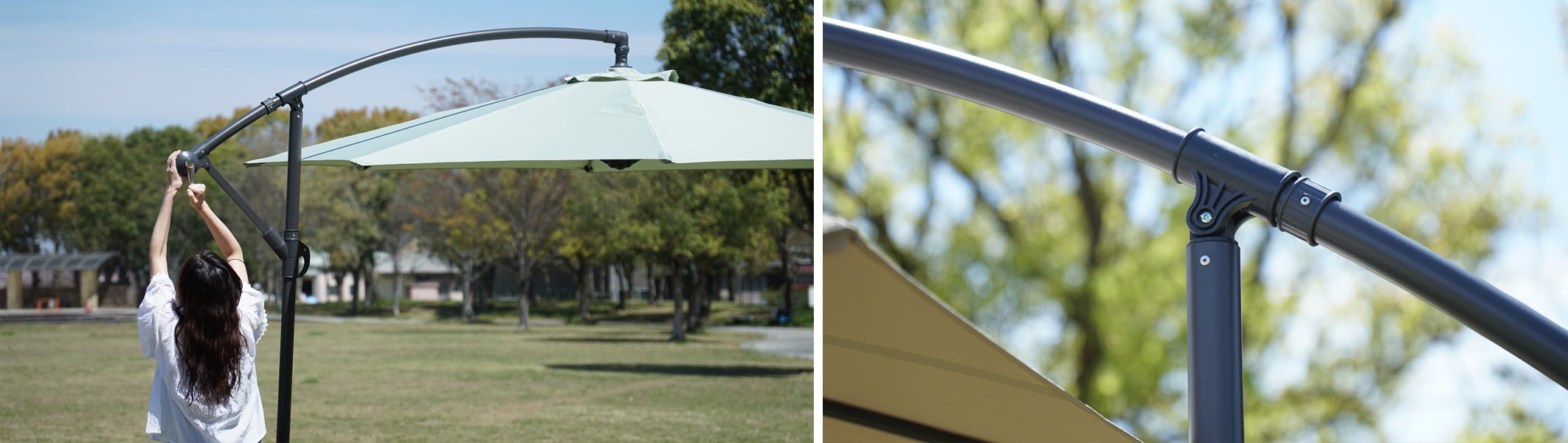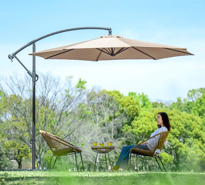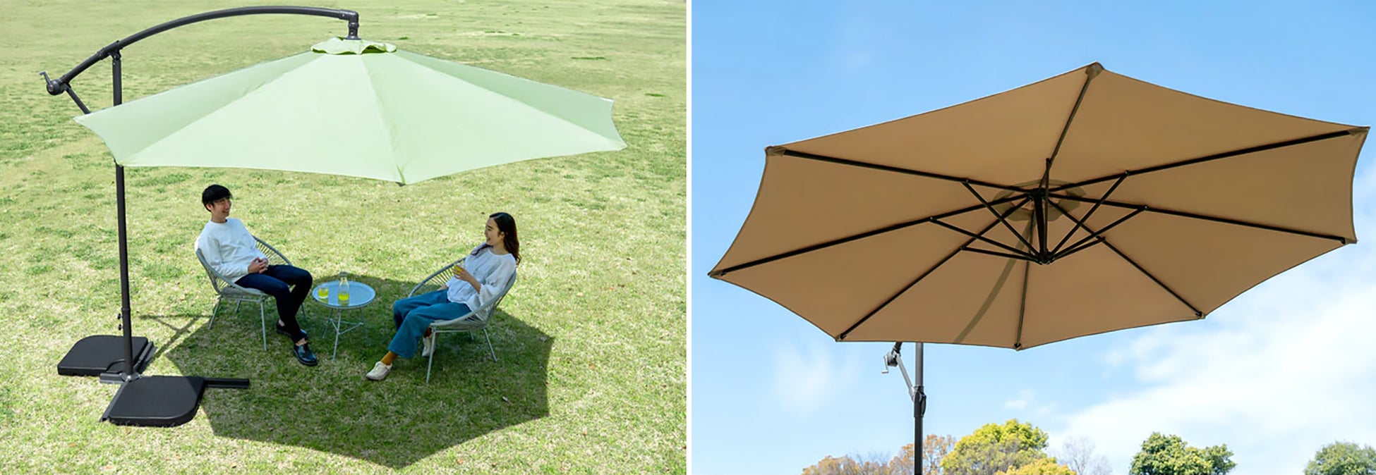 新たに発売となったガーデンパラソルは、直径3mのワイド設計と、パラソルを吊り下げ式にすることで支柱が邪魔をしないように設計しており、日陰スペースを効果的に広く確保しています。