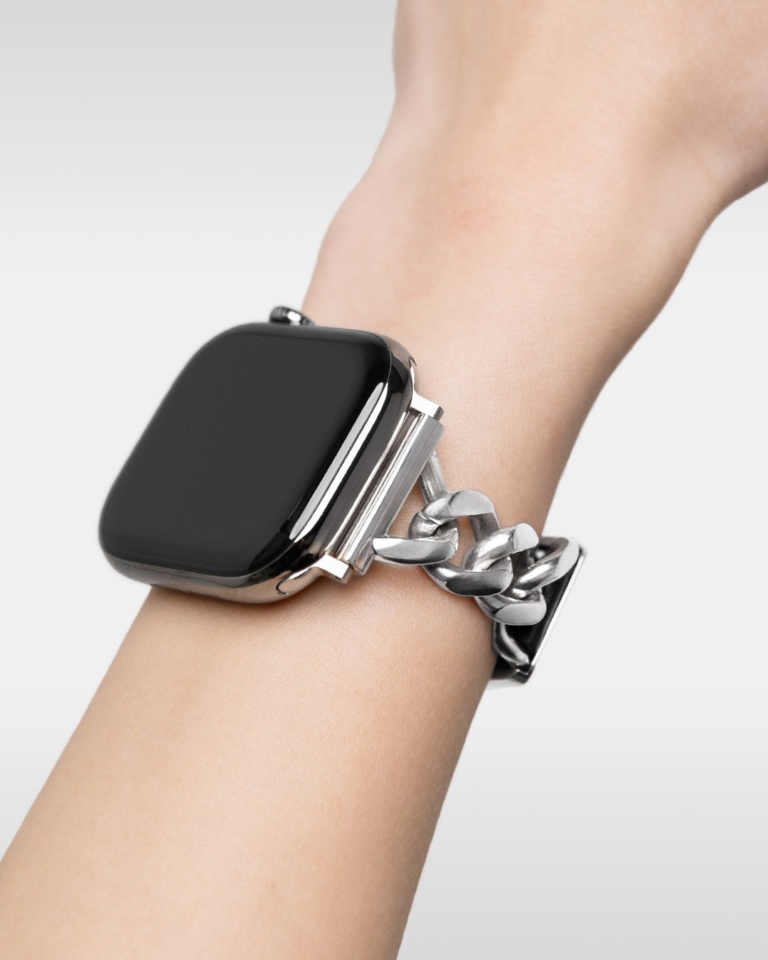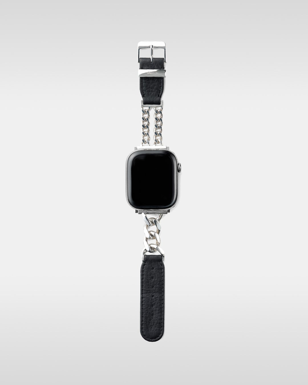 シルバー925製のチェーンとレザーをミックスさせたApple Watchバンド。1連と2連のチェーンを組み合わせ、ジュエリー感覚でApple Watchを身につけられるデザインに仕立てました。