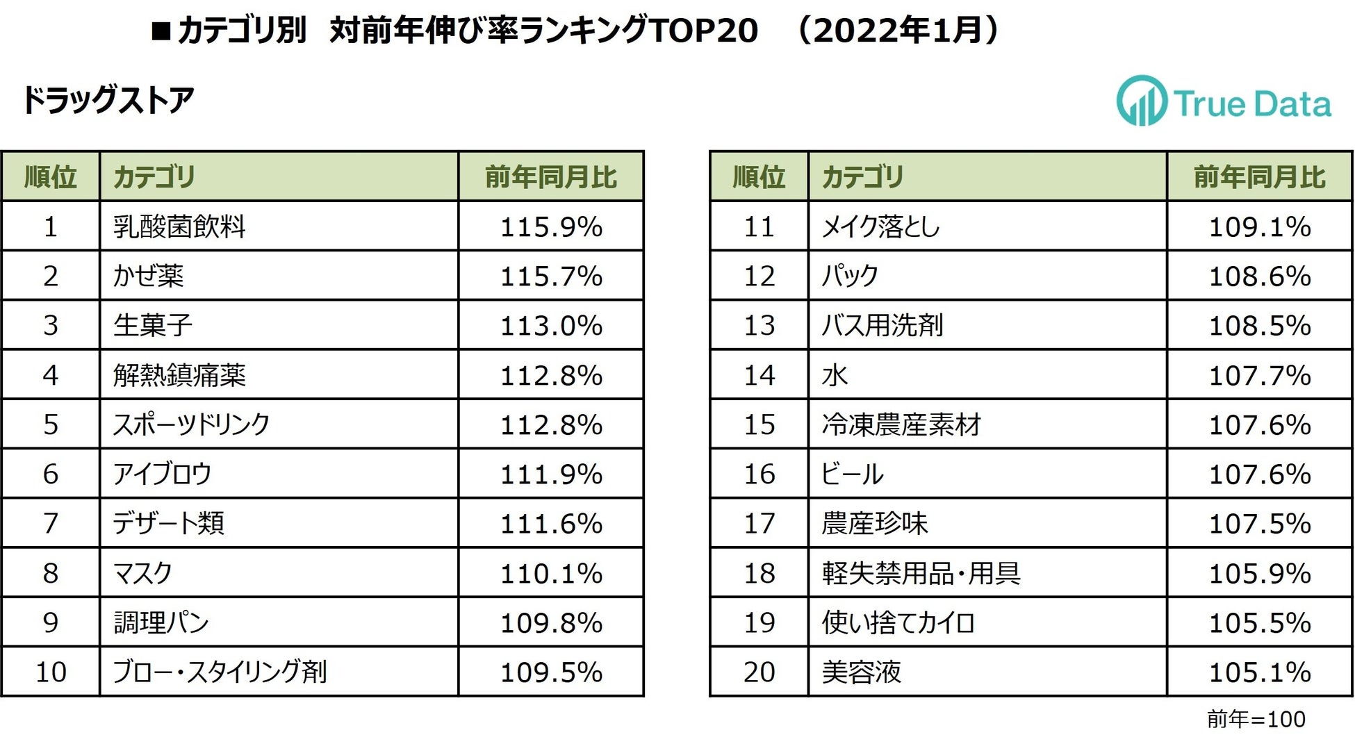 株式会社True Data(トゥルーデータ/本社:東京都港区、代表取締役社長:米倉 裕之) は、当社の統計データをもとに、ドラッグストア、食品スーパーマーケットにおける2022年1月の売り上げ伸長カテゴリを発表します。新型コロナワクチンを追加接種する人が増え始めた1月は、ワクチン接種による副反応への備えとして買われたためか「解熱鎮痛薬」や、「スポーツドリンク」の売り上げが伸長しました。また、売り上げの好調が続いている 「乳酸菌飲料」が当月はドラッグストアで伸び率ランキング1位となっており、コロナ下におけるヘルスケア商品の需要は継続しています。