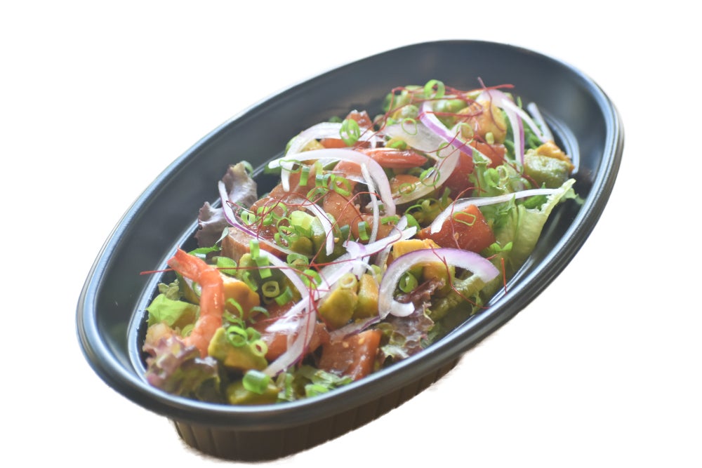 ●絹姫サーモンと幸海老のマリネ、トマト、アボカド、赤オニオン、サラダリーフの下に米を敷いた丼ぶり仕立て
