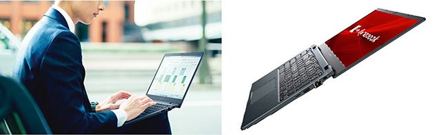 明るく色鮮やかなシャープ製13.3型IGZO液晶※注16を搭載し、太陽光や蛍光灯の下でも映り込みが少ないノングレアを採用しています。バッグなどに収まりやすく、持ち運びに便利な約875g※注2の軽さ、約17.9mmの薄さを実現した軽量コンパクトボディ。約24時間の長時間バッテリー駆動※注6。180度オープン可能なディスプレイなので、対面相手と画面共有が簡単にできます。アメリカ国防総省制定MIL規格に準拠した耐久テストを様々な項目で実施予定※注4。